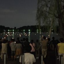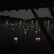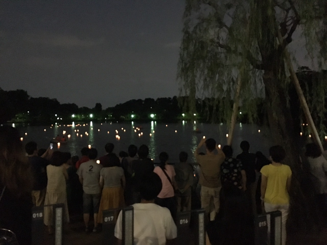 7月の中旬の日曜日、夜におこなわれている灯篭流しに行きました。たくさんの人が集まっていてみなさん写真を撮ったり自分が流した灯篭を探したりしていました。ボートハウスのあたりのテラスから綺麗に全体を見渡すことができて良かったです。次の日には綺麗サッパリなくなっていました。