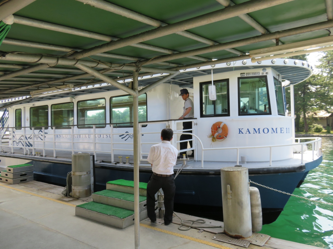 ツアーで初めて天橋立を訪問。新門司港から名門大洋フェリーで大阪南港に朝5時半の到着。バスで移動し、朝8時10分ごろ宮津市の天橋立湾内航路の天橋立の乗り場に到着、朝一番の8時半発の船に乗り、阿蘇海の対岸の一の宮駅に12分で到着。途中で天橋立を横に見ながら、3km以上の松の並ぶ砂州を横目に、船は移動した。カモメが船と一緒に飛んでいた。爽やかな朝の海だった。