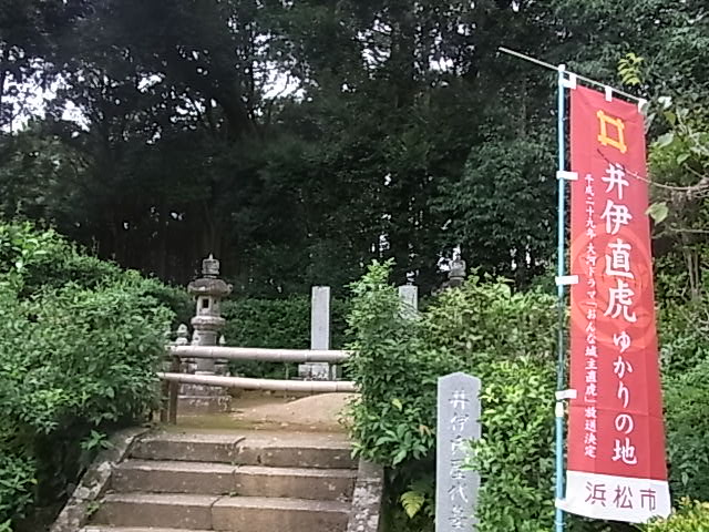 外へ出て向かって左手のほうに回るとほどなくして井伊家の墓所があり、大河ドラマののぼりが立っています。