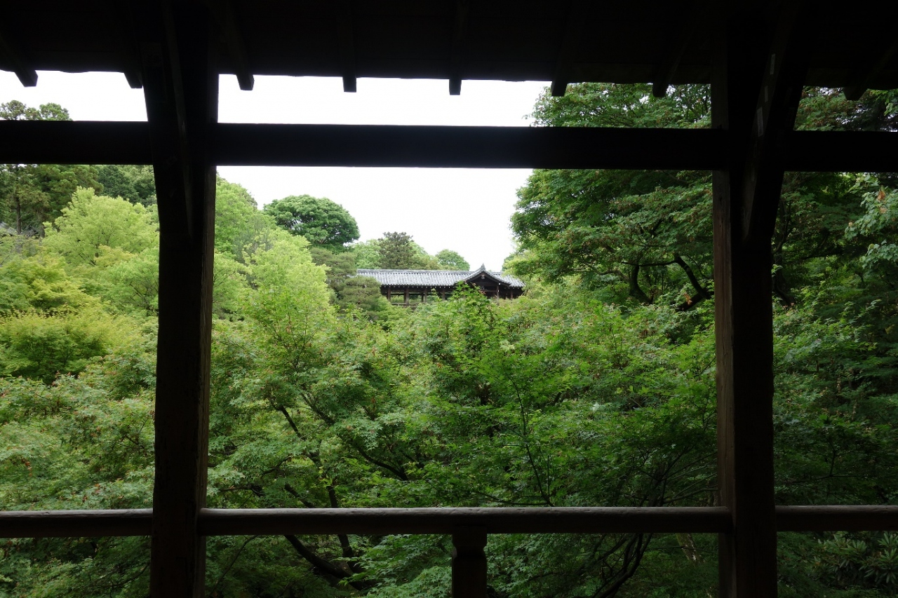 東福寺を訪れた際に、この木造の橋を渡りました。橋からは青紅葉をはじめとする緑の木々の景色が楽しめ、その向こうには通天閣も顔をのぞかせていました。人はあまり居なくて静かな時間をゆっくり楽しめましたが、次回は紅葉を楽しみに来てみたいものです。
