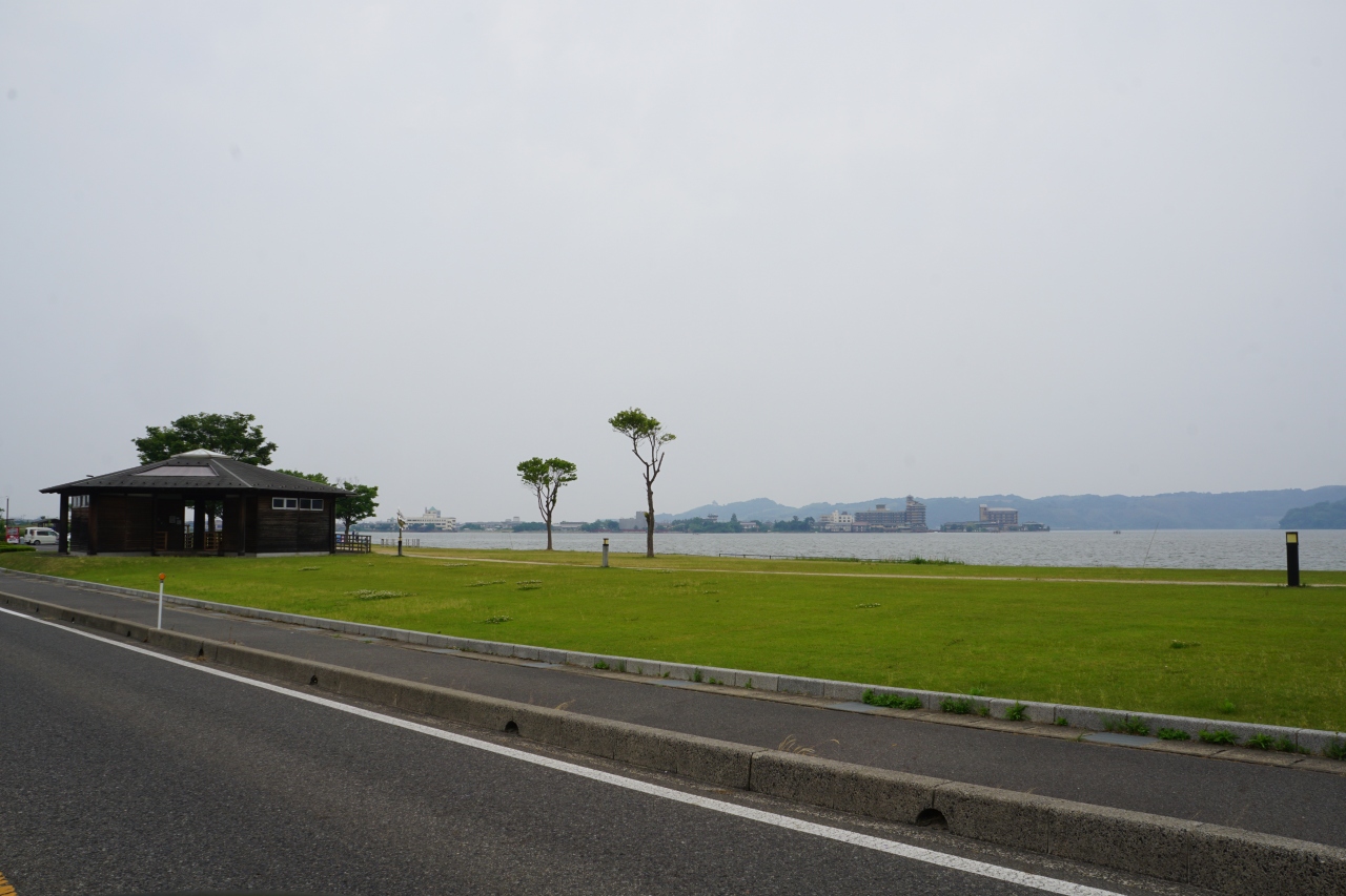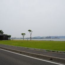 東郷湖の周辺には東郷湖を見渡す公園がいくつかあって、めぐみのゆ公園は東郷湖の西南部。向かいに東郷温泉の市街地を見渡せるのに加えて、少し高くなった場所に足湯の施設を備えています。周囲は芝生だし、のんびりゆっくりの公園となっています。