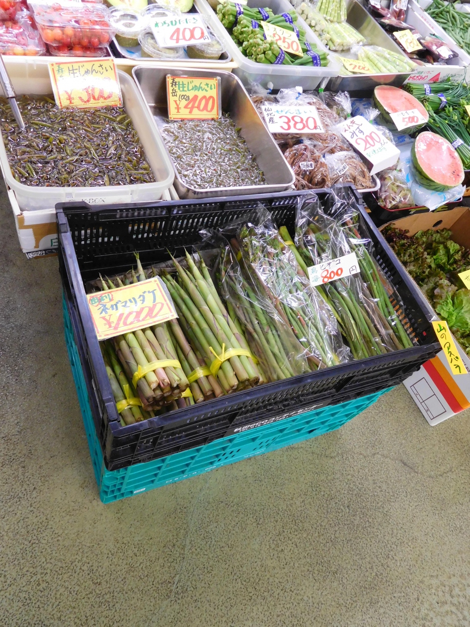 秋田駅近くの食品市場です。どこの地方に行っても大きな市場に行けば、その地域に特有の食材があったりして楽しいもの。ここもそういう市場です。日本海の魚介類もいろいろありましたが、特に目についたのは旬の食べ物、ネマガリダケでした。旅行中だったので買えませんでしたが。