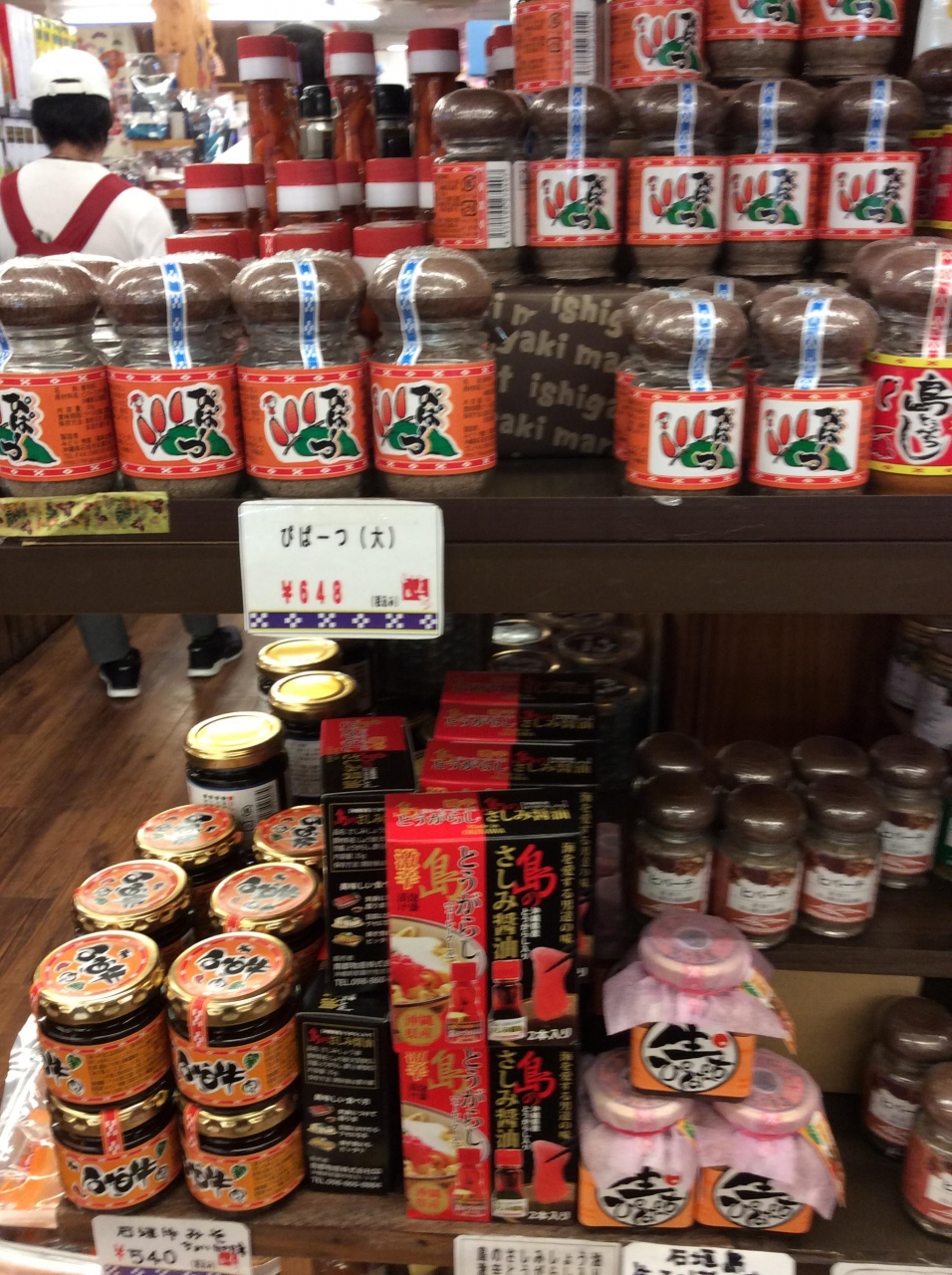 ユーグレナモールの中にある大きなお土産屋さんです。石垣島のお土産はなんでも揃っていましたが、特に「ピパーツ」がたくさん並んでいました。ピパーツは「ピパーチ」ともよばれる島コショーで八重山そばにかけたりして使うようです。以前テレビでピパーツが体に良いと言っていたのが影響しているのかもしれません。入り口の上の方にウミガメの写真があったので、お店の目印になると思います。