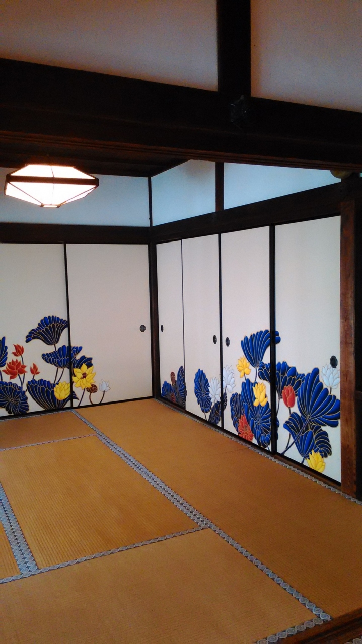 広間のふすま絵が見たくて今回の旅で訪れました。本来ふすま絵は伝統画材を使用するようですが、こちらは現代的な画材を使用して、鮮やかな蓮が描かれています。