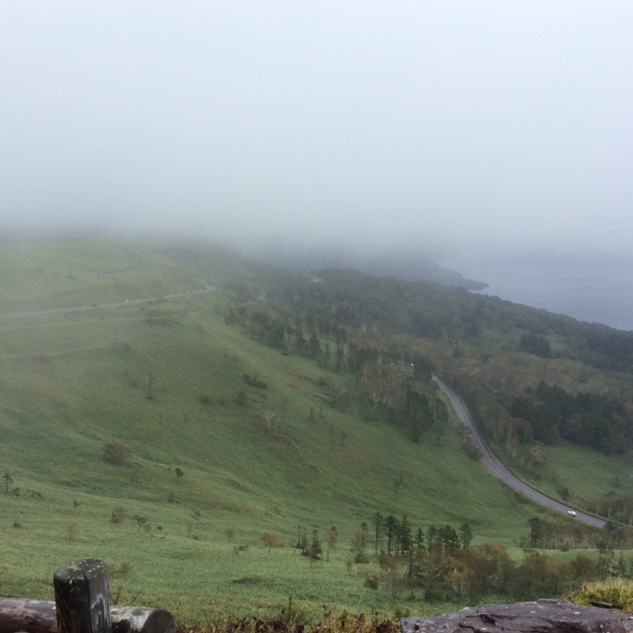 また、遠くの知床連峰までも一望できる場所らしいのですが、残念ながら、当日は、天気が非常に悪く、やっと屈斜路湖が見えただけでした。