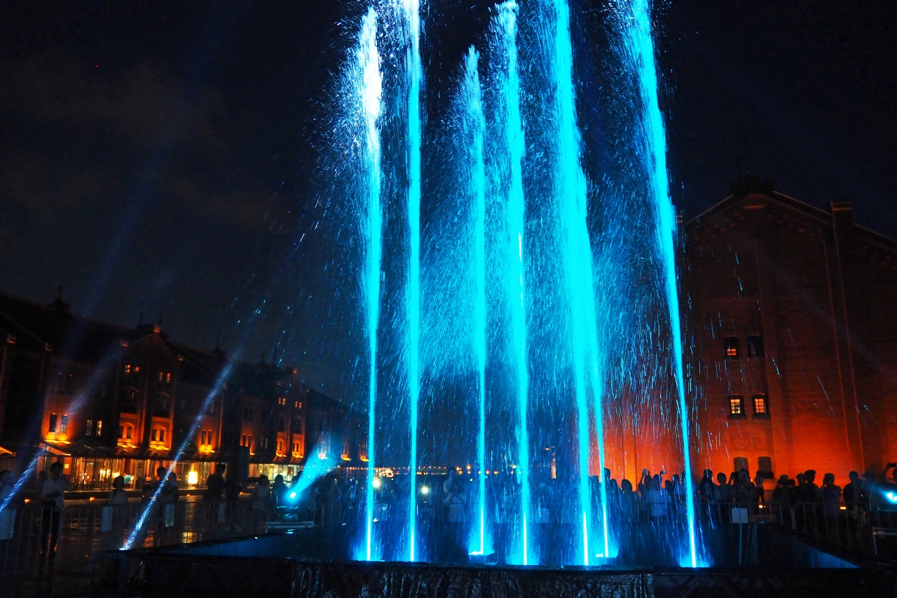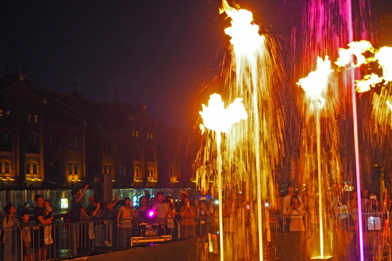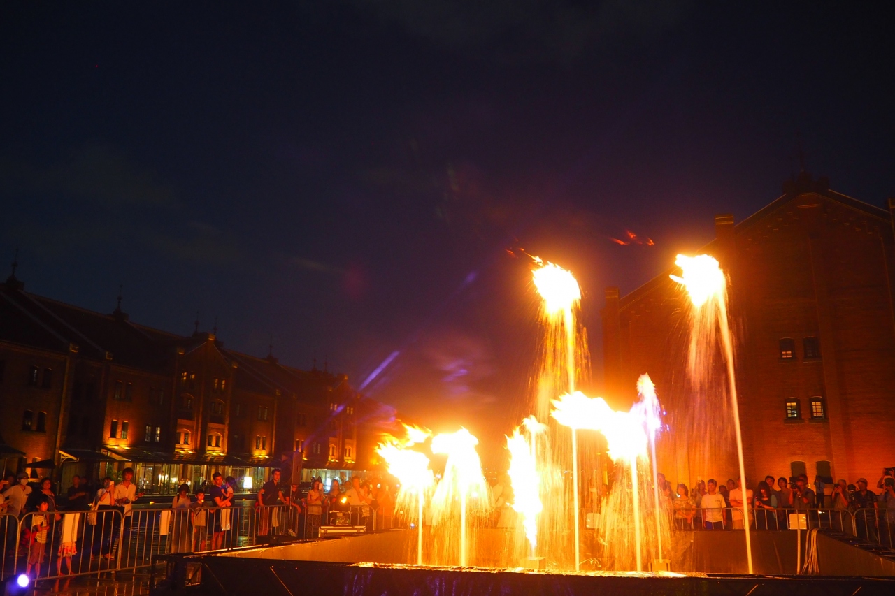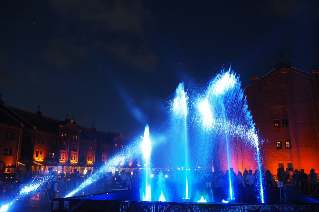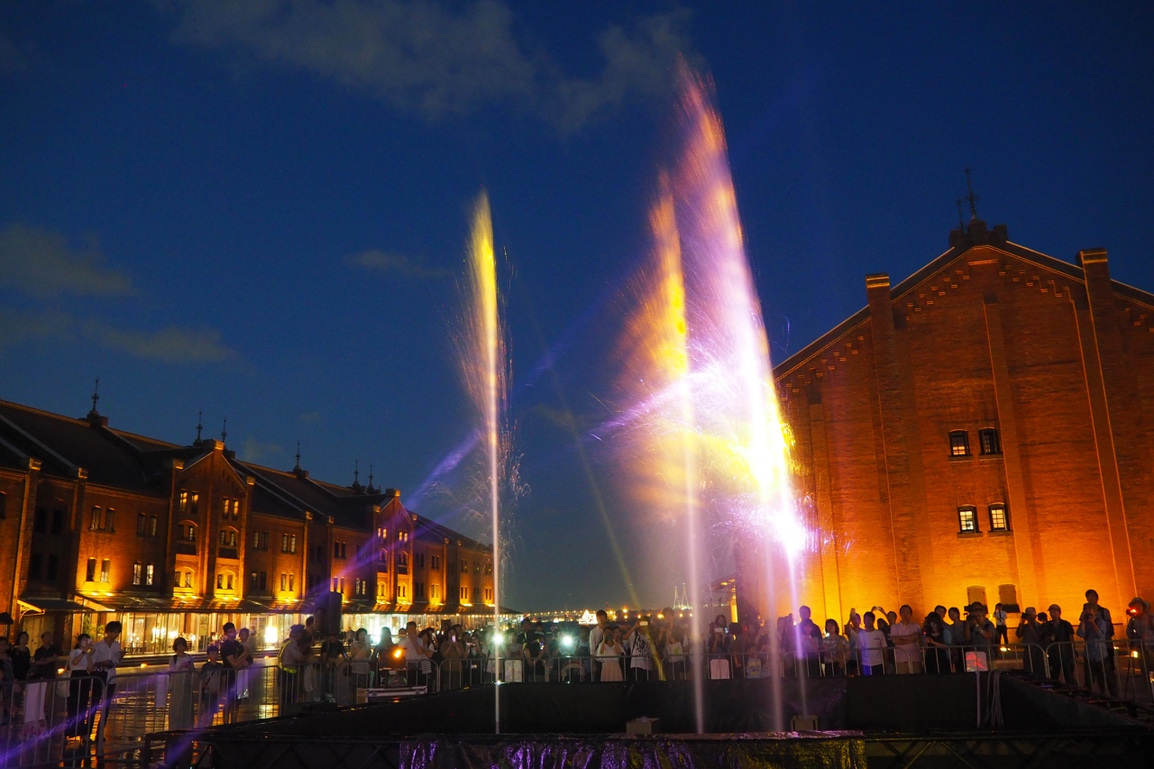 横浜赤レンガ倉庫では7月21日~23日の3日間、15周年記念イベントとして炎と水を使った新感覚の噴水ショーを開催。赤レンガ倉庫の夜景を背景にイベント広場の中央に設置した7本の噴水が音楽に合わせてリズミカルに動き幻想的な世界を創ります。
