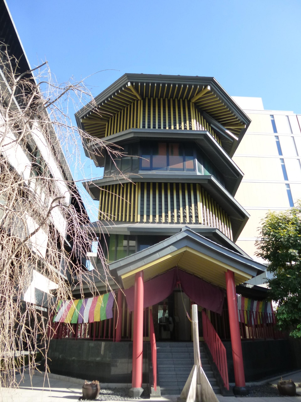 屋根の形から、仏教系の施設であることは想像がつきますが、デザイン性豊かな奇抜な外観で、ついつい写真を撮りたくなる建物です。