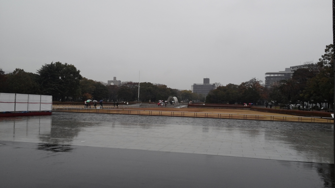 ドーム型は、戦時中の事故による悲しみの記憶をもたらします。雨天はさらに悲しみの雰囲気を強め、人が集まていました。他の都市と比較して、広島での訪問の特別なポイントです。記念碑の場所にも花が置かれていました。