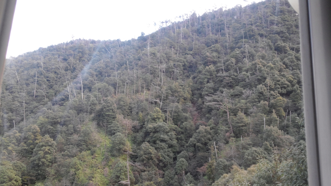 冬の間でさえ、緑の葉と良好な形の背の高い木。おそらく、森林に見る最高の場所は、ロープウェイ内だと思います。自然の環境と最近の世界遺産の一部を守るために、どこにでも火を控えるように促している板があります。