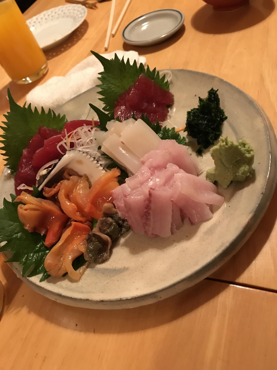 色々料理を注文したが、例えば、「刺身の盛り合わせ」は、まぐろ、赤貝、赤貝の肝、たちうお、するめいか。付け合わせに、あおさのりもついていた。どれもとても新鮮で美味しかった。