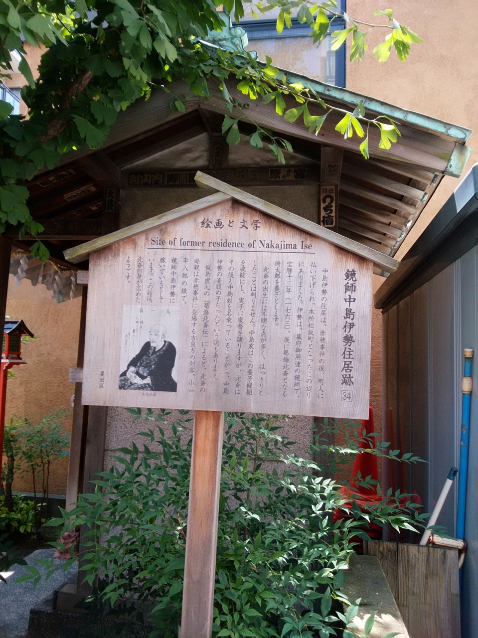 JR両国駅から徒歩10分程の閑静な住宅街にありました。本所松坂町公園(吉良邸跡)の目の前にある飯澄稲荷神社のあたりに中島伊勢の住居があったようです。飯澄稲荷神社の脇には、案内板があり、それによると中島伊勢という人物は江戸幕府御用達の鏡師で、葛飾北斎を養子とした人物でもあったようですが、残念ながらこれ以外はよく分からなかったです。