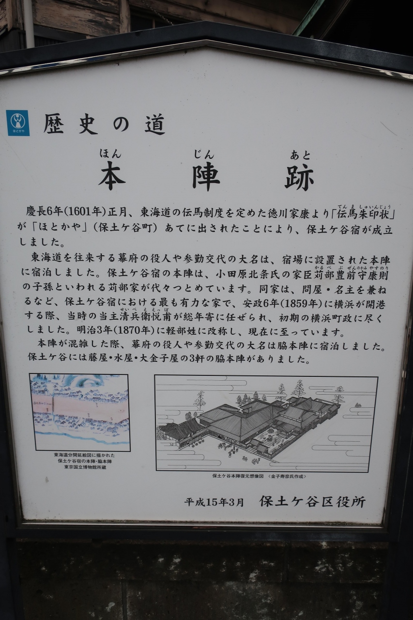 東海道五十三次の4番目の宿場町である保土ヶ谷の本陣が国道1号線保土ヶ谷橋交差点のそばのあります。近寄って見ると本陣であった刈部家には現在、通用門しか残っていません。案内板を見ると当時は相当大きな本陣で参勤交代の大名が宿泊した場所であることが分かりますが、今はその姿はありません。本陣跡自体は見ごたえはないですが、ここが保土ヶ谷宿の中心地であったと思うと、当時の姿を想像してしまいました。