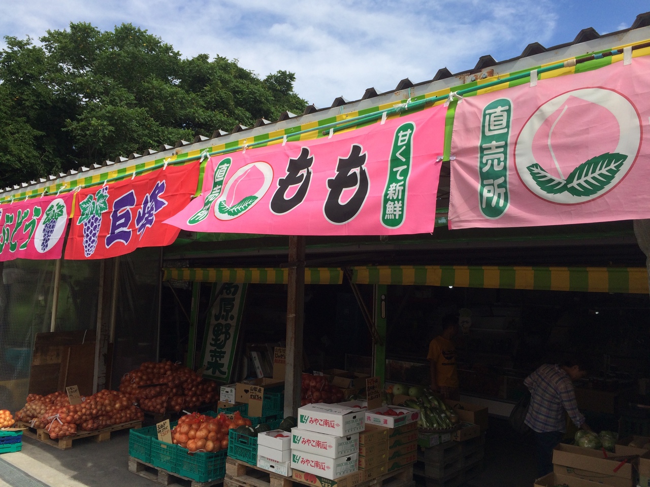 地元産の桃、トウモロコシといった野菜がリーズナブルな価格で販売していました。