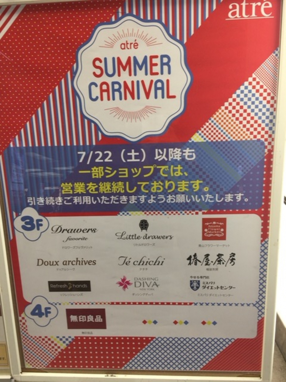 アトレ川崎は7/22から3階と4階で改装工事をやってるようです。でも一部改装工事みたいで、営業しているお店も沢山ありました。バーゲン開催中で、50%オフやお店によっては70%オフなども有りました。かなりお得ですよね。