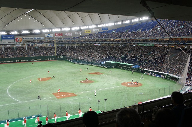 首都圏に住んでもう20年以上、東京ドームにようやくデビューしました。といってもプラチナチケットと化した巨人のゲームではなく都市対抗野球です。東京ドームだけでなくラクーアやドームシティ、ホテルなどが建ち並ぶ一帯は、都心とは思えないレジャースポット。巨人のゲームがなくても、ドームへ向かうコンコースはたくさんの人が歩いていました。都市対抗野球らしく各企業のテントが並んでいます。無関係なこちらは正面入り口横のチケット売り場で1700円のバルコニー席を購入しました。グラウンドに近い1階席と2階席の間の縦4段ほどしかない小さな席。もちろん、巨人戦ならこんな値段で入るのは無理でしょうけど。さすがドームです、入るとひんやりどころか寒いぐらい。バルコニー席は上方にテレビがあり試合を中継しています。ちょっとのディレイがあるけど、あれって見逃しを防ぐ効果でも狙っているのかなあ。わーっという音は先に聞こえるのでちょっと違和感があります。それにしても都市対抗はうるさい。ベンチの上でパフォーマンスを展開するため、ブラスバンド、太鼓がネット裏近い場所で大きな音をたてています。アルプススタンドのある甲子園は遠くで音が聞こえる感じですが、ネット裏すぐそばがでガンガン聞こえます。なんかゲームを見る集中力が切れる感じです。入った経験がある広島球場や神宮球場に比べ、そうとうでっかい感じ。特に内野の2階席は見えるのかいなって思います。ついでに右中間、左中間に膨らみがない変わった構造。ホームランが出やすいはずだわ。