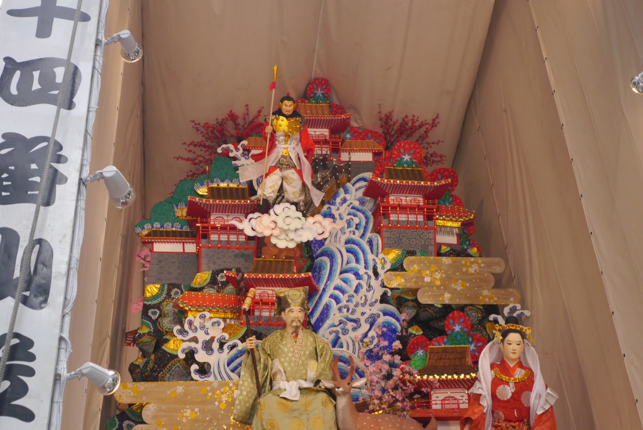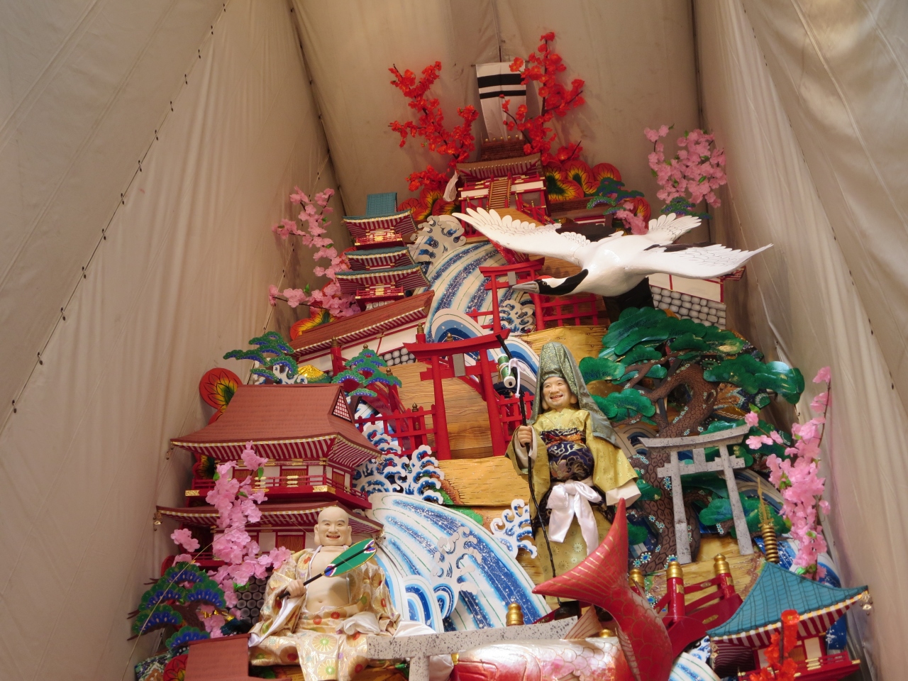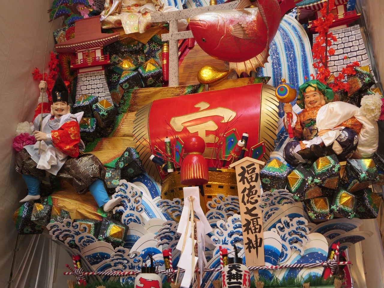 このアーケードの中に飾り山が置かれています。天神一丁目の飾り山は表は「福徳七福神」見送りも「福徳七福神」。別々の人形師によるもので、どちらも見ごたえのある作品でした。