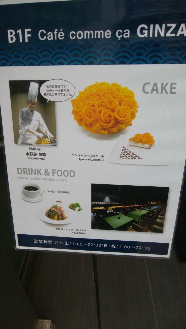 とても見た目が鮮やかで目をひくフルーツをふんだんにつかったタルトなどのお菓子がおいしいカフェコムサ。ただ最近フルーツにこだわったケーキ屋さんがすごくたくさんあるので、一時のブームより自分も食べる頻度がすごく減りました。ただマンゴのきれいにデコレーションされている看板につれてました。