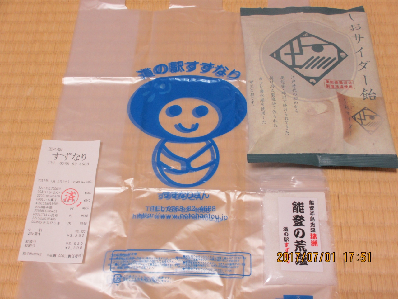 塩サイダー雨と、塩田の塩の小袋をもらった。