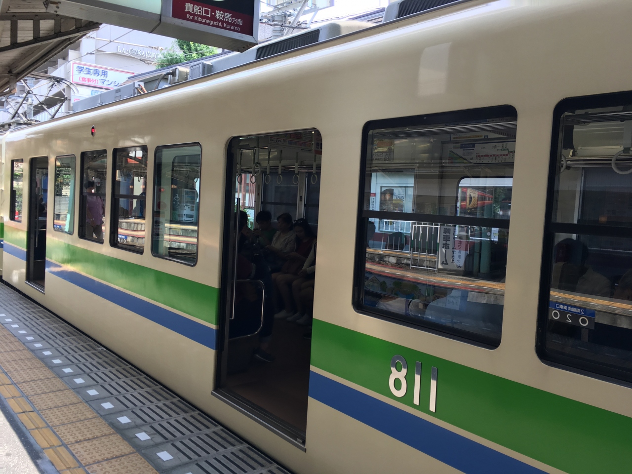 貴船へ涼みに行く際に利用。川床のシーズンで、20分に1本の列車で2車輌しかないこの電車は、出町柳駅から既に満席。展望列車のきららには帰路に乗車できました。水・木曜日は車輌点検のため、本数が通常の半分程度に間引きされています。