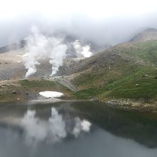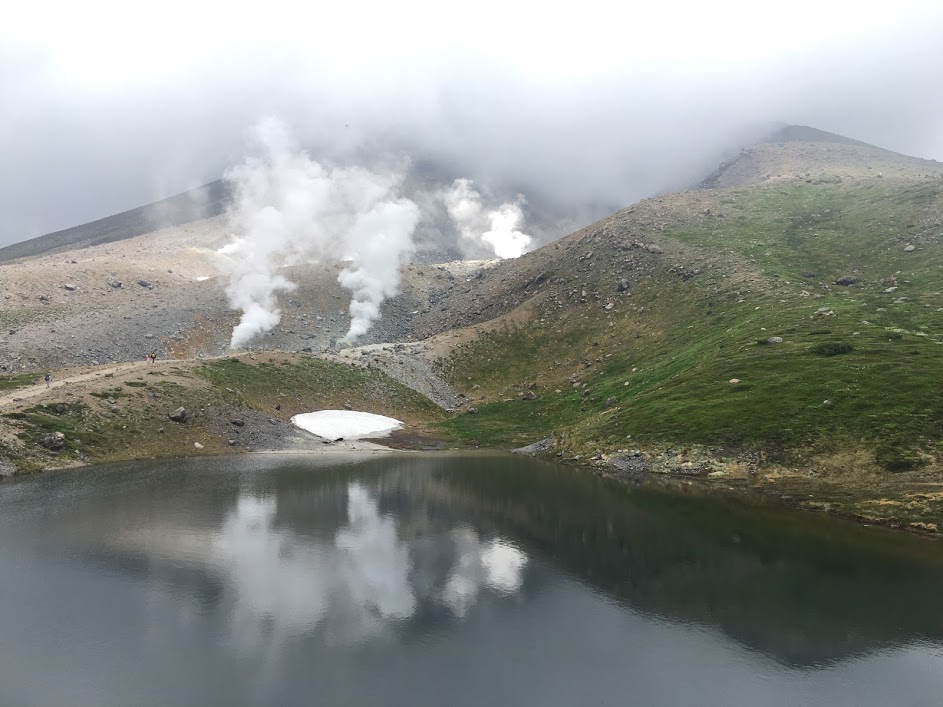 晴れて風の無い日は旭岳がくっきりと映るという池。残念ながら、雲がかかっていて、山頂は見えなかったが、池の周りは雪渓が残っていたり、高山植物があったりと、楽しめた。ロープウェイからは30分程出いけるため、人は多い。なぜか結婚式の写真をとっている中国人がいて驚いた。