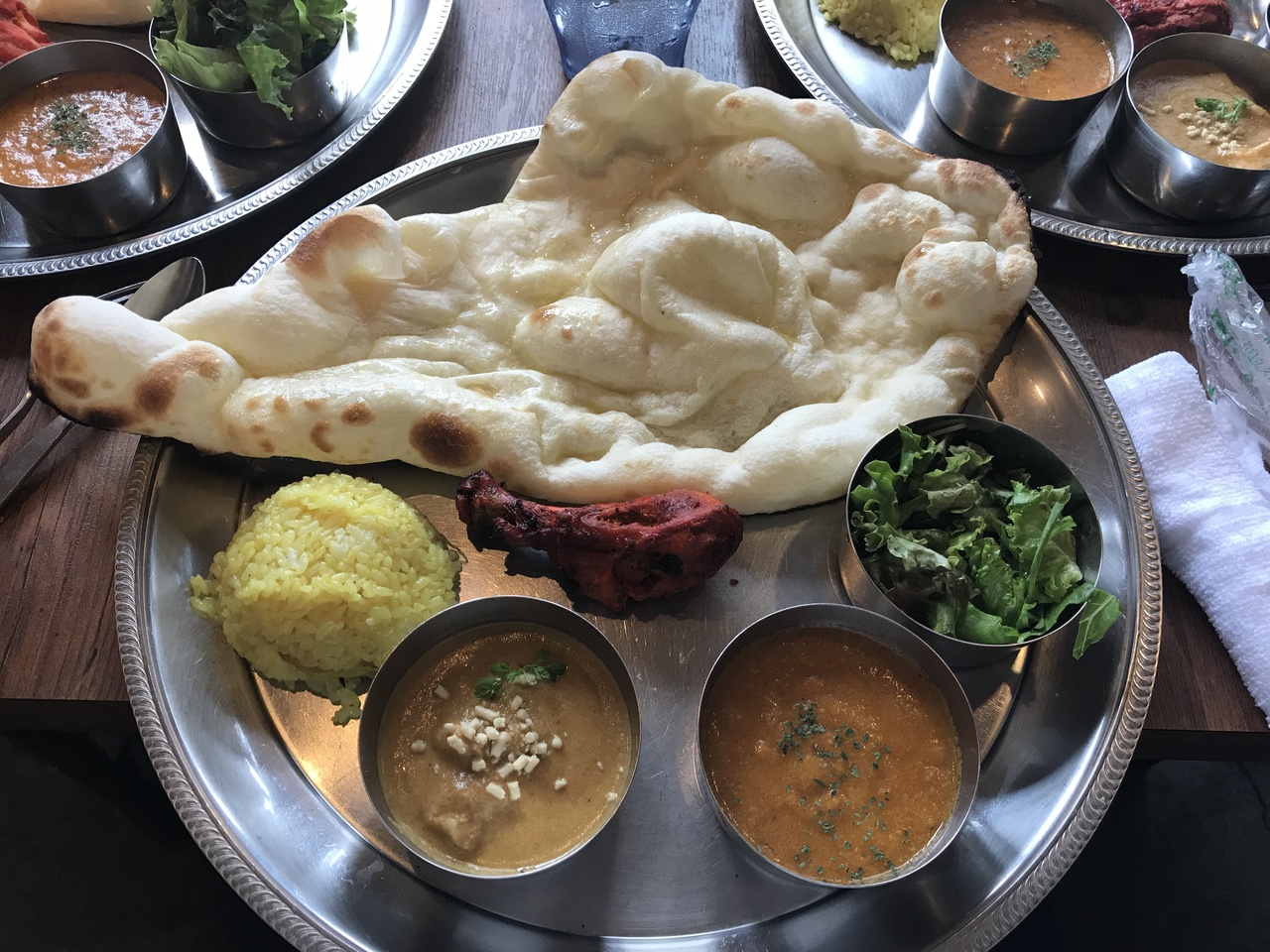 平日の12時頃にランチで行きました。1280円のセットを注文。サラダとタンドリーチキン、カレー2種類とナンとライスがついていました。ドリンクもついています。カレーは辛さを選べて中辛にしましたがマイルドな味でした。ナンは何もつけずにそのまま食べても甘みがあっておいしかったです。ボリュームもあって美味しくて満足でした。