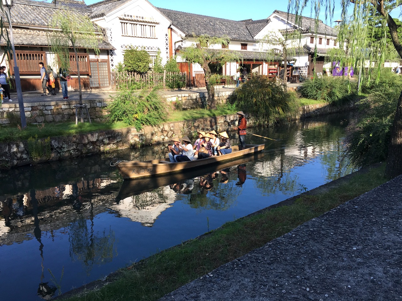 現在美観地区を流れる川はそんなに大きくないのですが、白壁の建物に囲まれ、昔ながらののんびりとした風情を保っています。予約すれば往時を偲ぶような船乗り体験もできます。