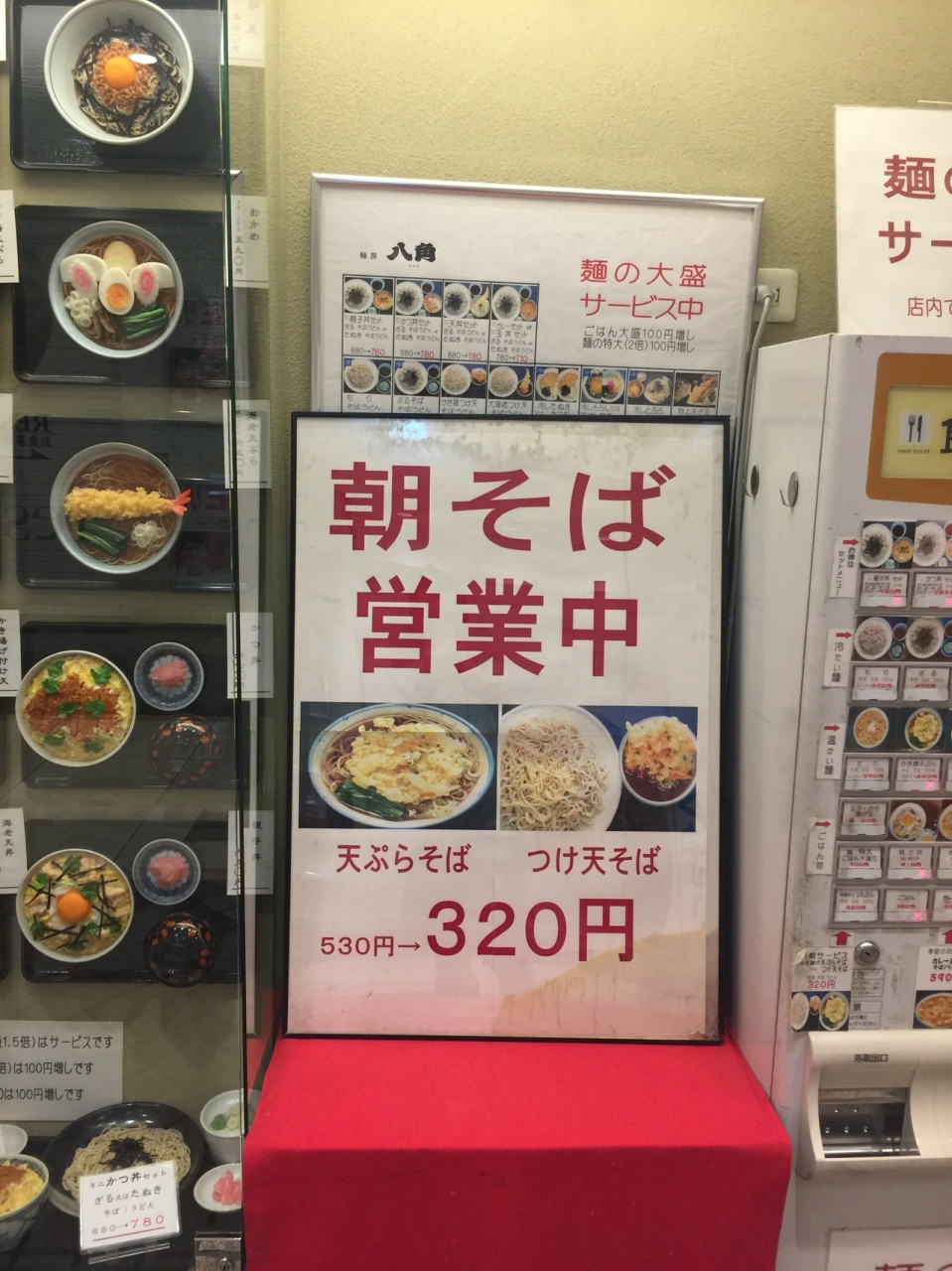 朝そばは天ぷら蕎麦が530円から320円になります。