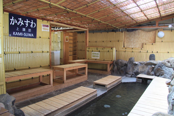 霧ヶ峰にニッコウキスゲなどを見に行く際、上諏訪駅を利用しました。1番線ホーム(新宿方面行)に乗降者が無料で利用できる足湯があります。以前は露天風呂だったようで結構広かったです。足湯を利用する時間がない方は足湯の前の蛇口から温泉が源泉かけ流しされていますので手湯のようにお手軽に利用しても良いと思われます。