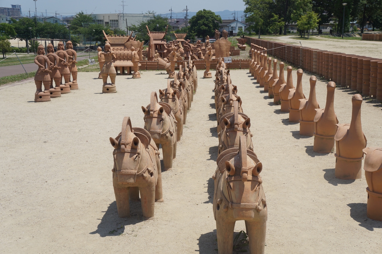 今城塚古代歴史館側には人馬や家屋の埴輪の並ぶコーナーがあって、それも必見かと思います。