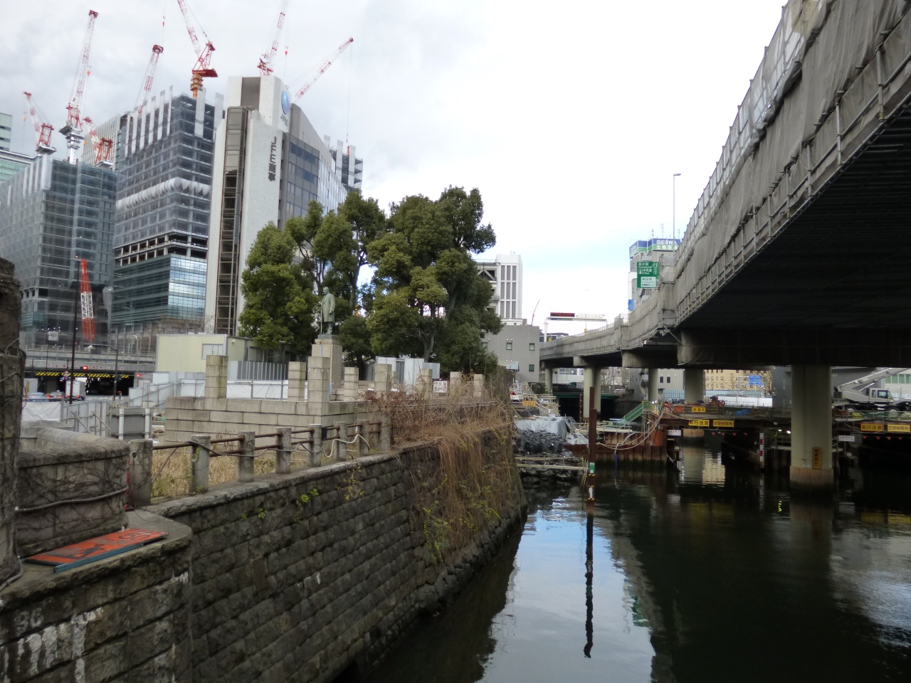 日本銀行のそばに、常盤橋があります。橋を渡ると、祖箕輪橋公園があり、渋沢栄一郎の銅像が建てられています。その向こう側に門跡があるのですが、この辺りはずーっと工事をしていて、行く手が阻まれるところが多いです。常盤橋の上から見ると、石垣の一部を確認することができます。