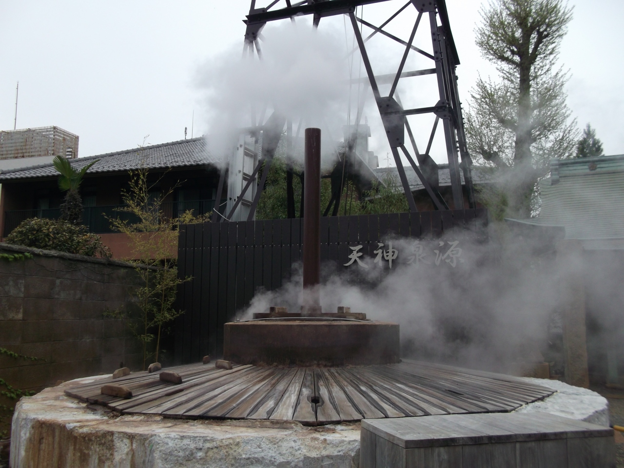 上り下りの多い有馬温泉街を歩いていると、いくつかの泉源の出会います。この泉源は温泉街に入りすぐの急な階段を上った先にあります。鳥居をくぐると奥には小さな神社が見え、その手前にある大きな釜のようなものからはモクモクと湯けむりが立ち上っていました。さすがに日本三大温泉といわれるだけあって、その勢いはすさまじいものがありました。