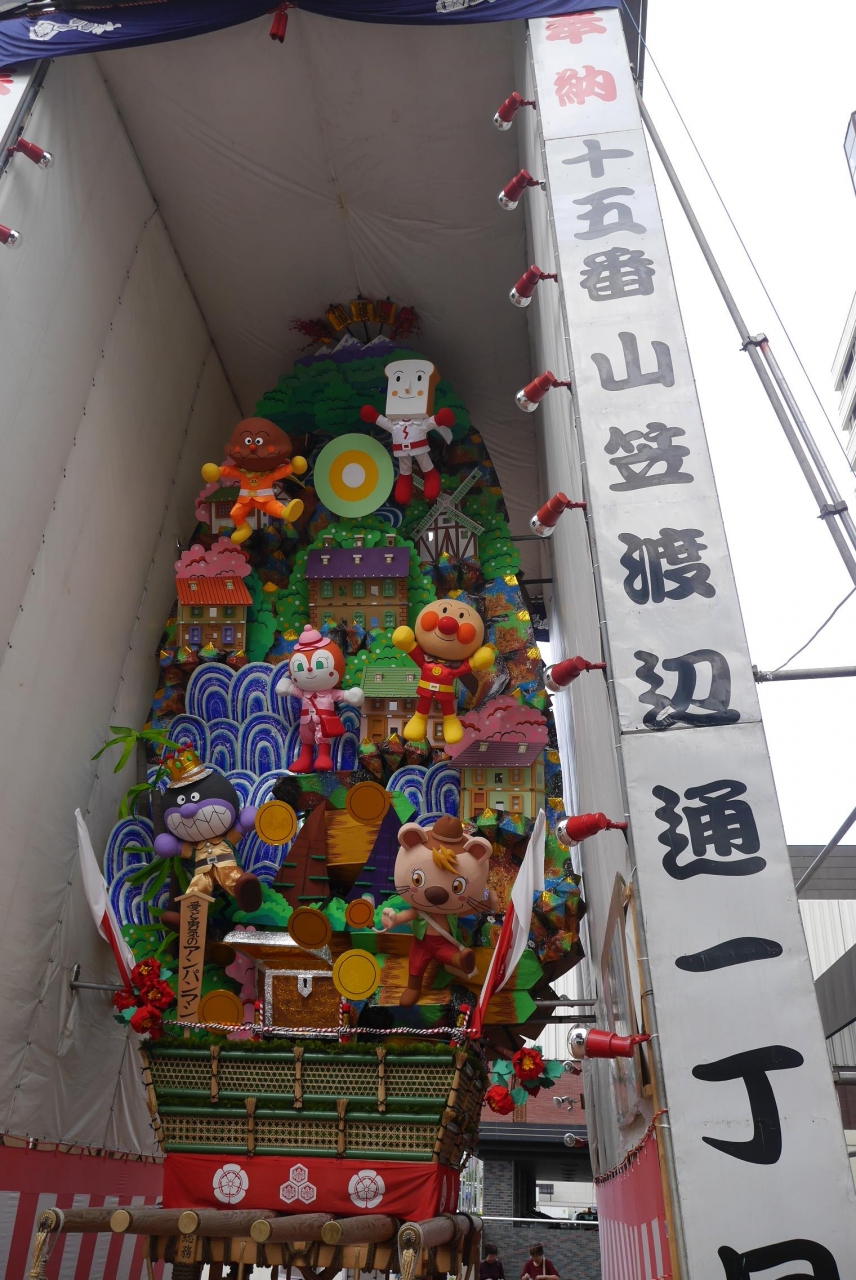 地下鉄駅を出た所に渡辺通り一丁目の十五番山笠が飾られていました。表は「合戦関ヶ原」、井伊直虎の姿もありました。見送りは「愛と勇気のアンパンマン」でした。