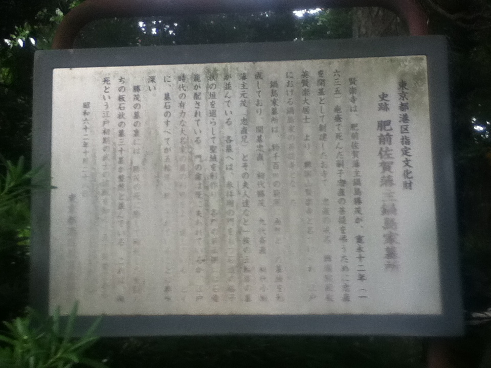 麻布十番駅の南西、大黒坂沿いの賢崇寺内にある。本堂の裏手にいくと、肥前佐賀藩主鍋島家墓所がフェンスに囲まれている。周辺は静かである。お勧めの点は、鍋島家墓所には開基忠直、初代勝茂、9代斉直、初代小城藩主元茂(忠直兄)とその夫人達など一族の五輪塔の墓が並んでいること、賢崇寺は肥前佐賀藩主鍋島勝茂が寛永12年(1635)疱瘡で死んだ嗣子忠直ぼ菩提を弔うために創建した寺であり鍋島家と賢崇寺の長い関わりについて思いをはせるのも楽しいこと、境内には復興頌徳碑もあり併せて見るのもいいかもしれないこと、本堂で参拝すれば願い事が叶うかもしれないこと、周辺の麻布十番商店街で食事や買物を楽しむのもいいかもしれないこと、駅から徒歩で行けることである。