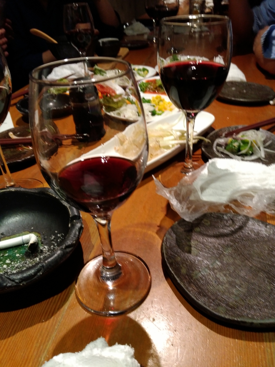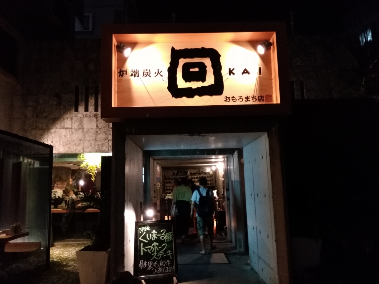 おもろまちで2軒目を探してこちらのお店へ。炉端炭火 回(KAI)。おしゃれな照明と店の作りで引き込まれました。内装も落ち着いており、やっぱりおしゃれな感じです。ワイン飲み放題とつまみを少々注文して飲み続けました。お部屋は奥に個室風のお座敷もあり良い雰囲気のお店でした。