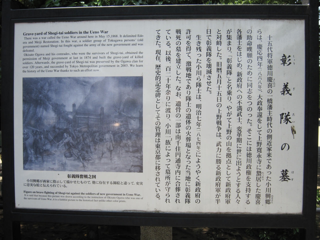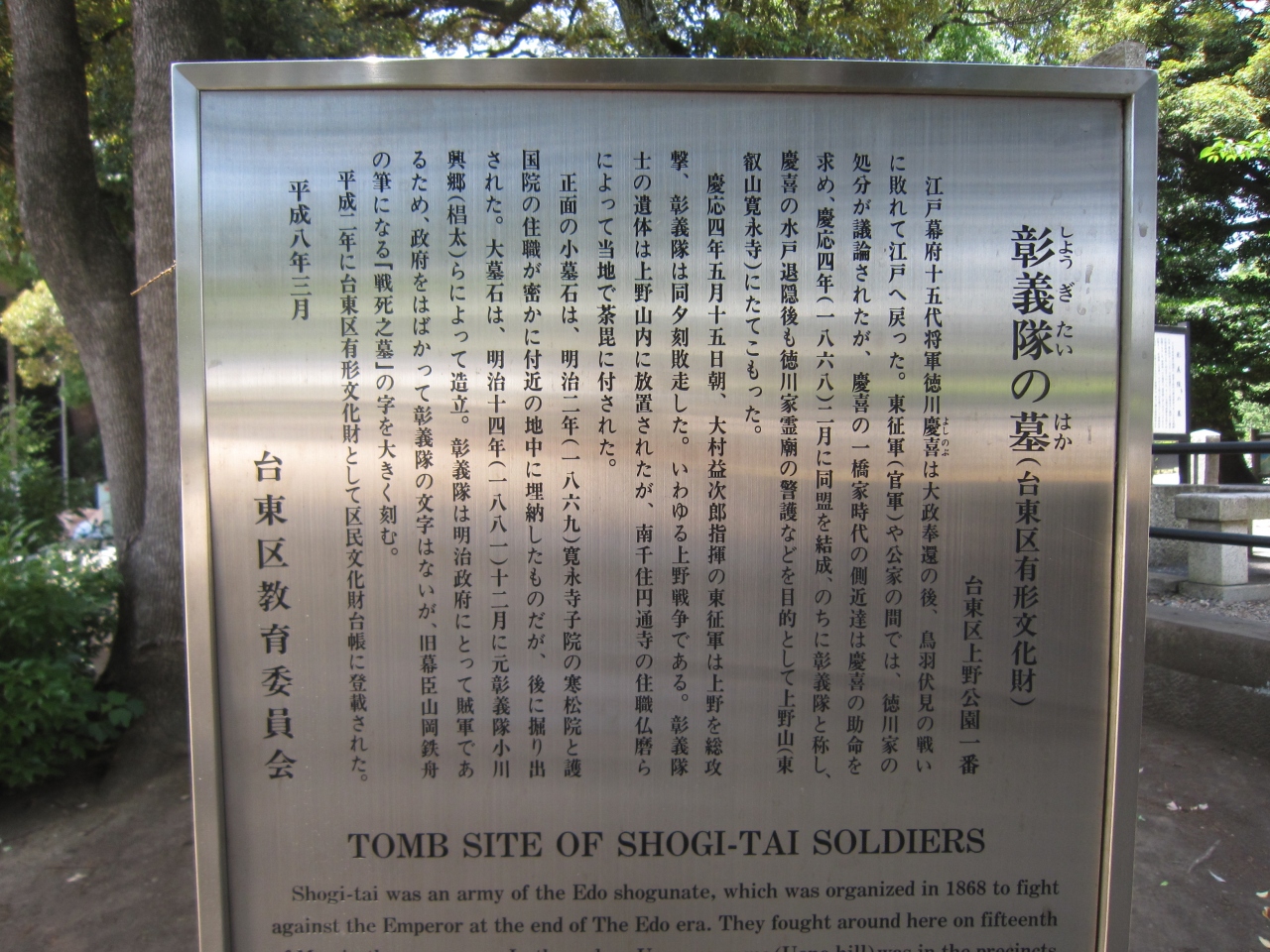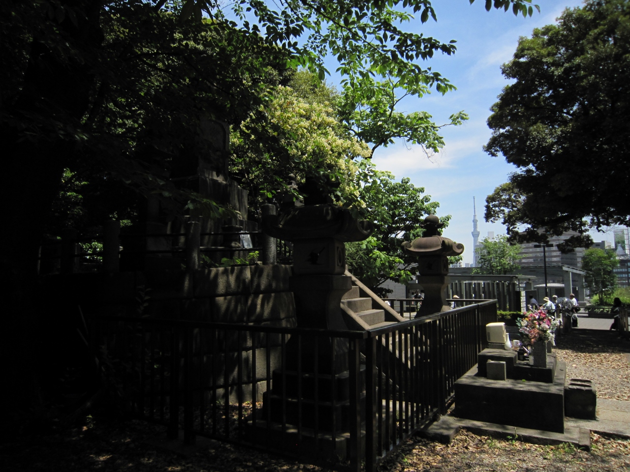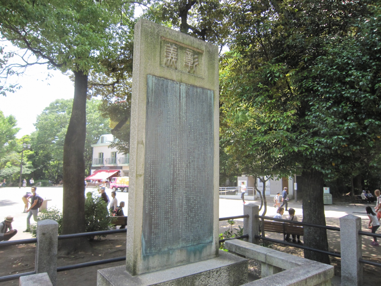 西郷銅像の後ろにあります。江戸から明治時代への変わり目に起きた上野での戦争、有名な話しですが、改めて説明板を読みました。この地で戦いがあったとは、今では想像も出来ません。小墓石と大墓石がありその前に花が添えられていました。西郷銅像見学後は清水観音堂方面に行く観光客が多く一部が寄るだけです。大墓石には明治政府にとって賊軍であるため彰義隊の文字がなく戦死之墓と刻まれているそうです。歴史を知るためにじっくりと見学する必要があると思います。遠くにスカイツリーが見えました。