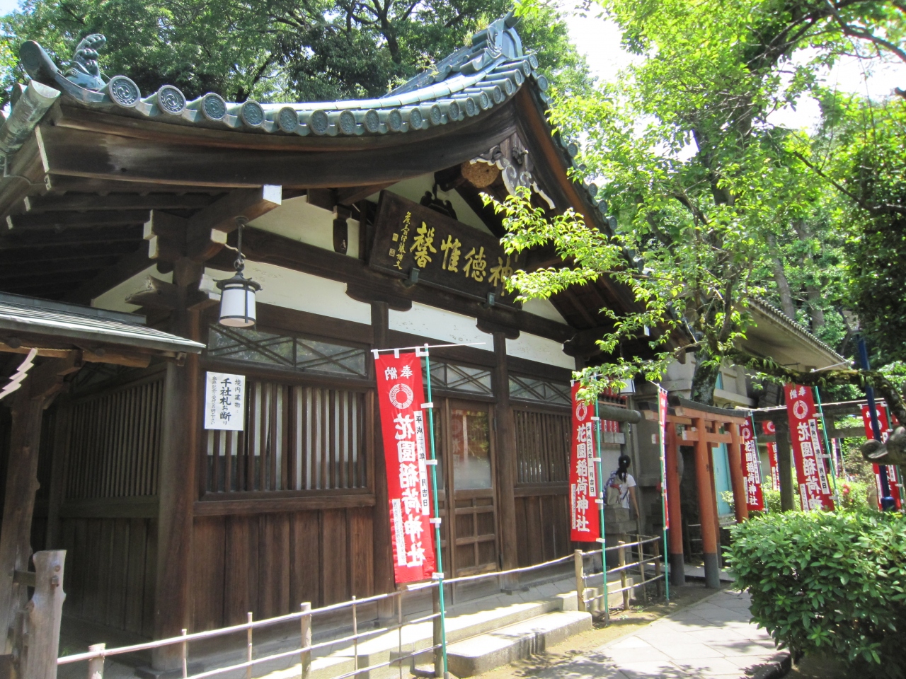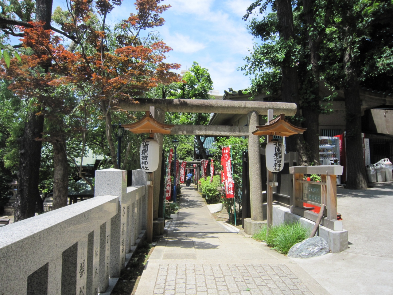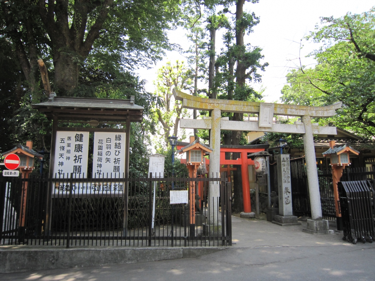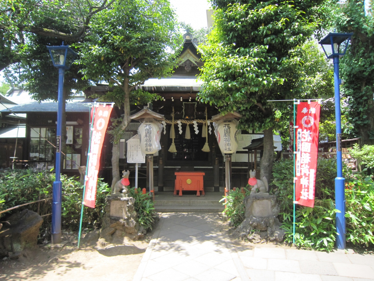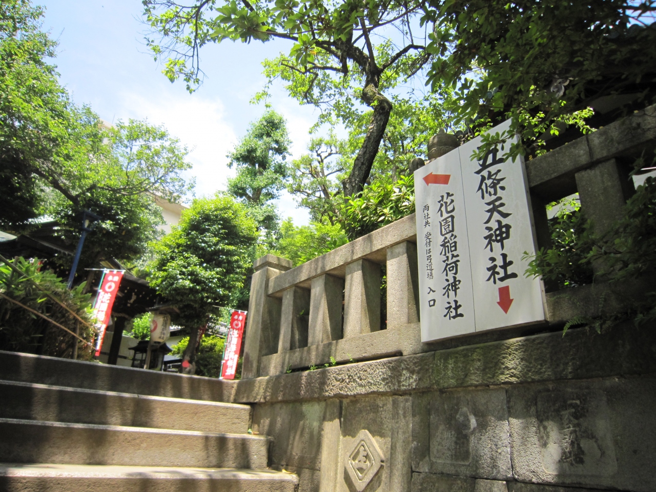 清水観音堂の石段を降り、右方面に行くと左側に花園稲荷神社の石鳥居と先に赤い鳥居が見えます。入口には花園稲荷神社と五條天神社の参道と彫った石柱がありました。花園稲荷神社は鎮座の年月や由緒は不明なようですが、穴稲荷、忍岡稲荷と言われたそうで、明治時代付近に花畑があり花園稲荷と改名、昭和に現社殿に遷ったようです。赤い鳥居をくぐり抜けて石段を下りると右側に社殿があります。多くの外国人観光客がいて写真を撮っていました。社殿を背に右側には石段を下り五條天神社、正面の細道は稲荷神社へのもう一方の入口になっていました。その途中に旧社殿跡でしょうか、穴稲荷への参拝口があり扉を開けて入れました。