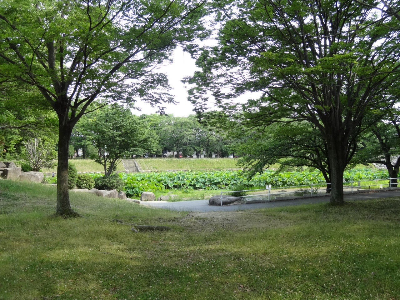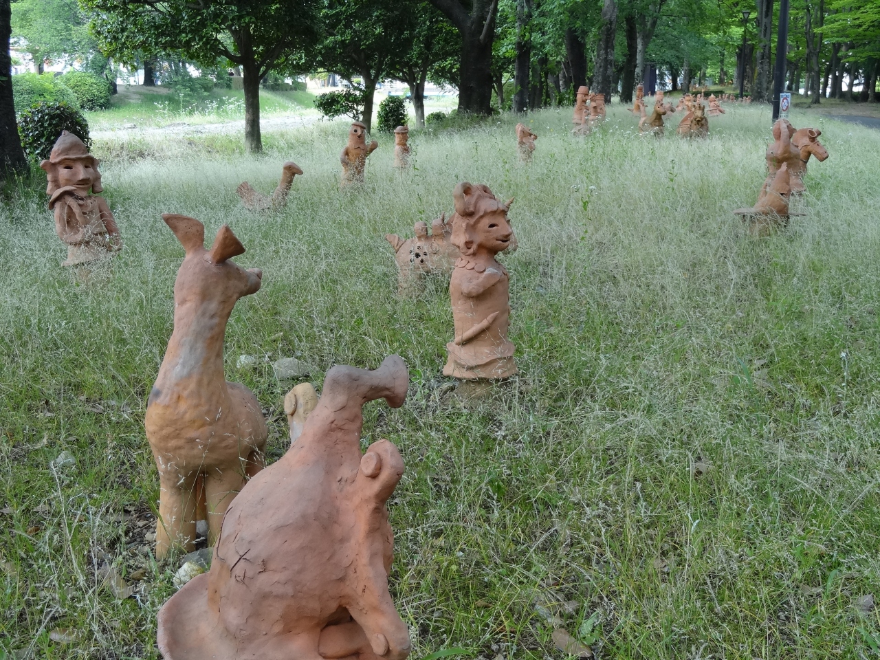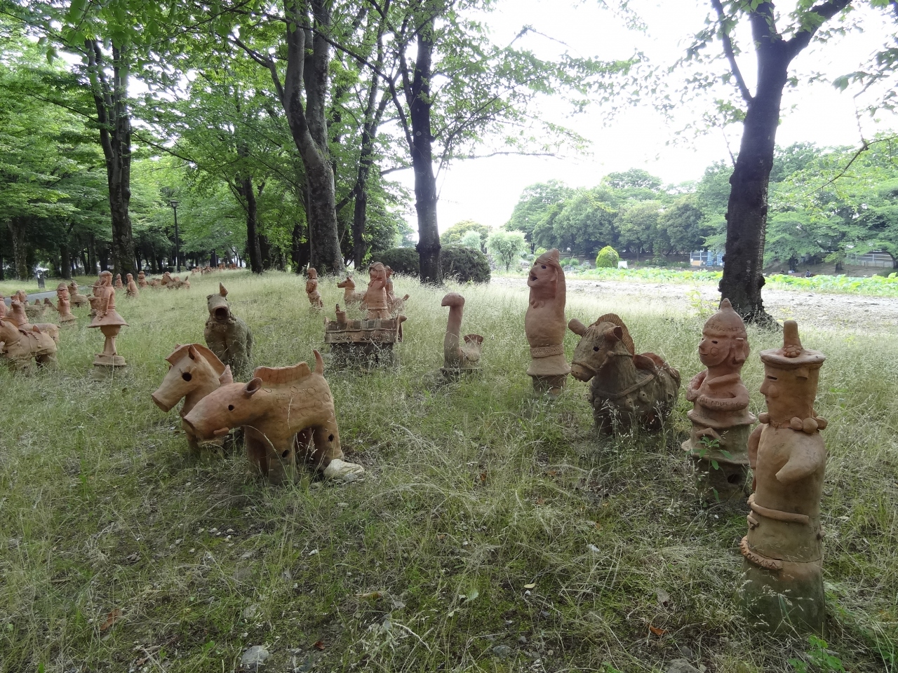 春日井市の福の湯で休憩中に新聞を読んでいて、この公園のハスの花が咲いているとのニュース記事を見て、この公園にやってきました。無料の駐車場があります。6台くらいは駐車できそうです。ハスの花が咲いている場所を見つけるのは難しくなかったです。まだハスの花は3分先くらいで満開もしくは散りはてた花は3本くらいでした。もう5日ほど後なら、最高の状態で観賞できるでしょう。できるだけ、8分咲きのハスの花を見つけて数枚写真を撮影しました。橋を渡って対岸を歩くと不思議な景色が。何と埴輪が50体ほど散策路の周辺に据えてありました。後で、調べたところ、これは「ハニワの道」とのこと。春日井市民の方の手作りだとか。現地で一体一体よく見ると埴輪それぞれがユーモラスな表情をしていて見ていても飽きません。公園にこういうオブジェを作っているとはとてもユニークだと思いました。