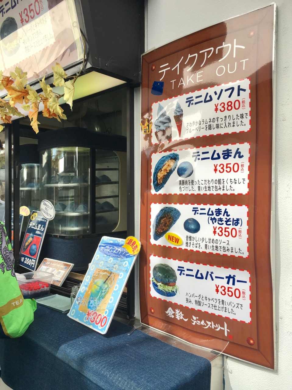 倉敷のお隣、児島といえば日本デニムの聖地。そのためここ倉敷にもたくさんのデニム関連ショップがありますが、ここは洋服だけではなくデニムにちなんだ青色の食べ物が売られているという、エクストリームな商店街です。