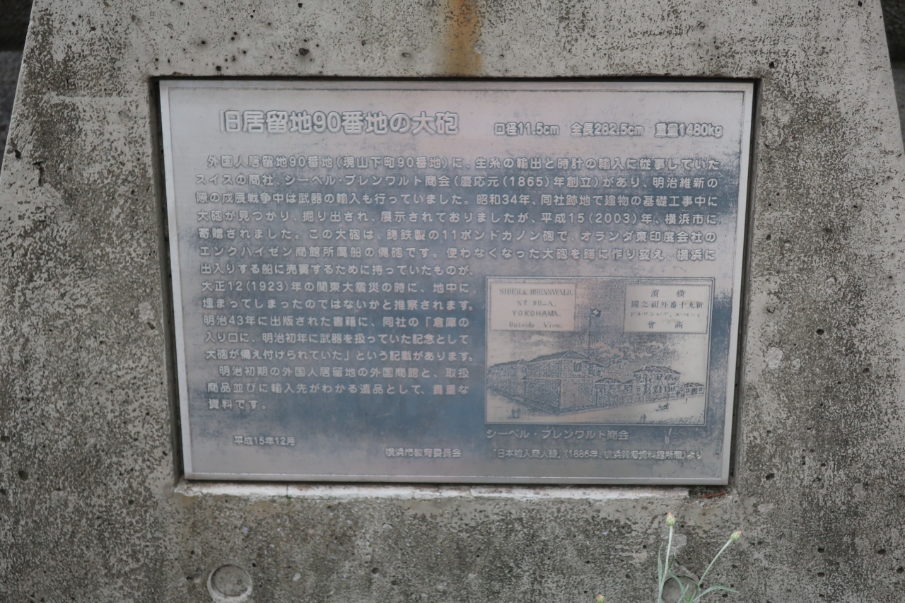 横浜 開港広場の奥の片隅、壁際に旧居留地90番地の大砲が展示されています。旧山下居留地90番地(現山下町90番地)の地中から3門見つかった大砲の一つ。
