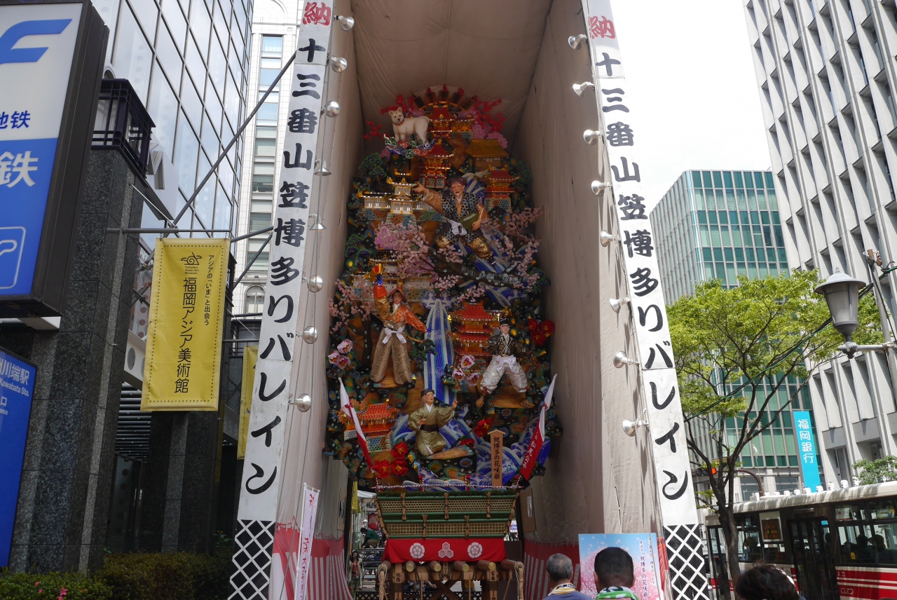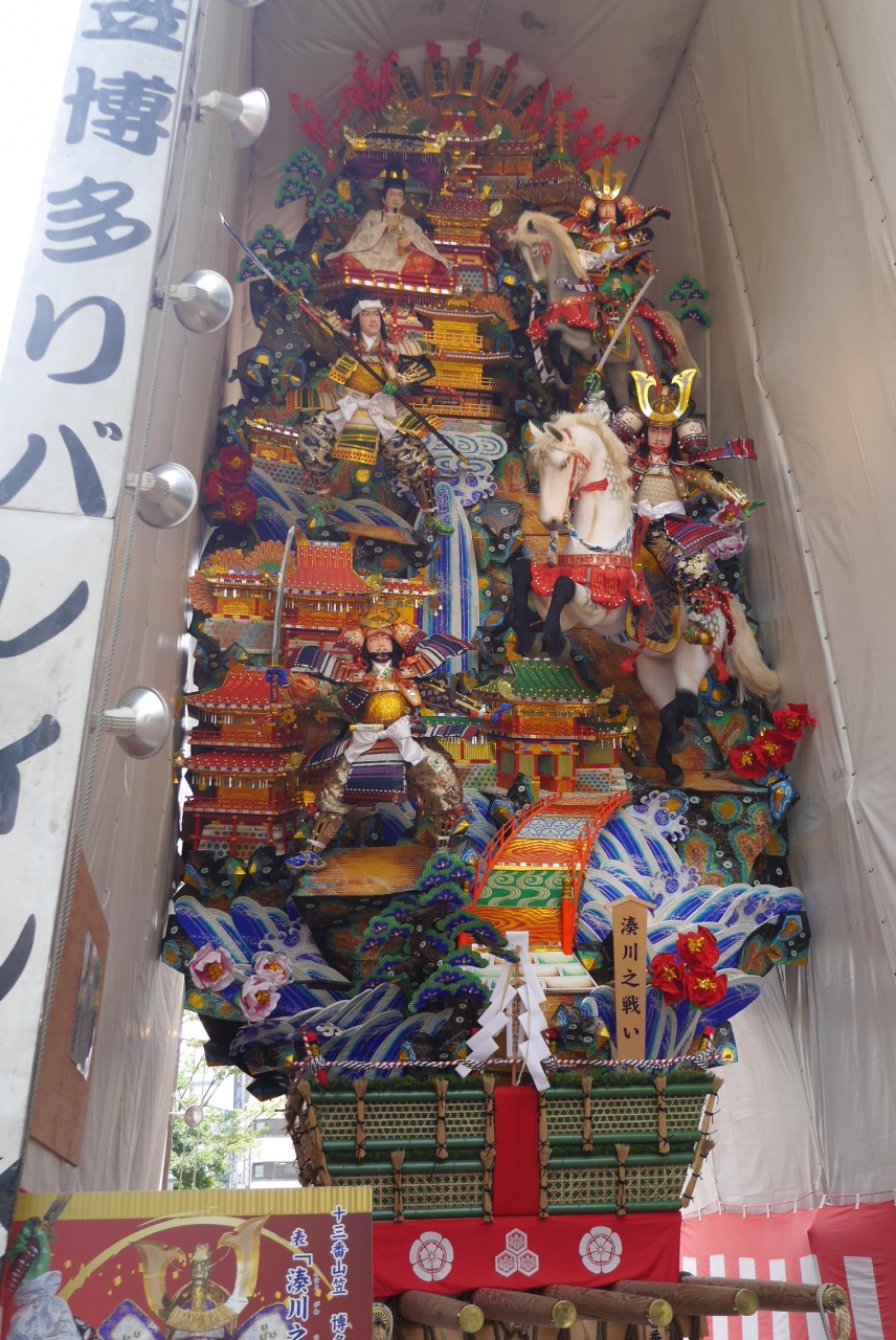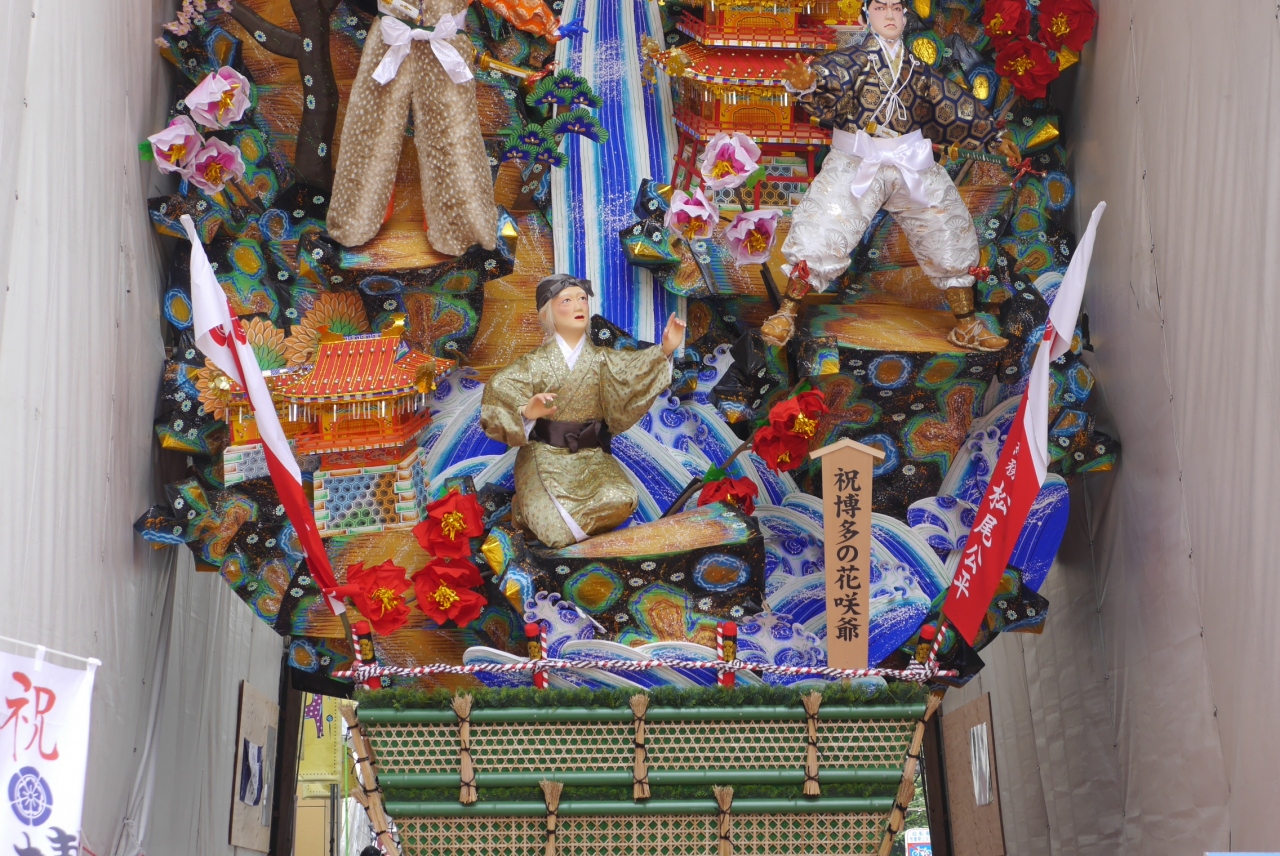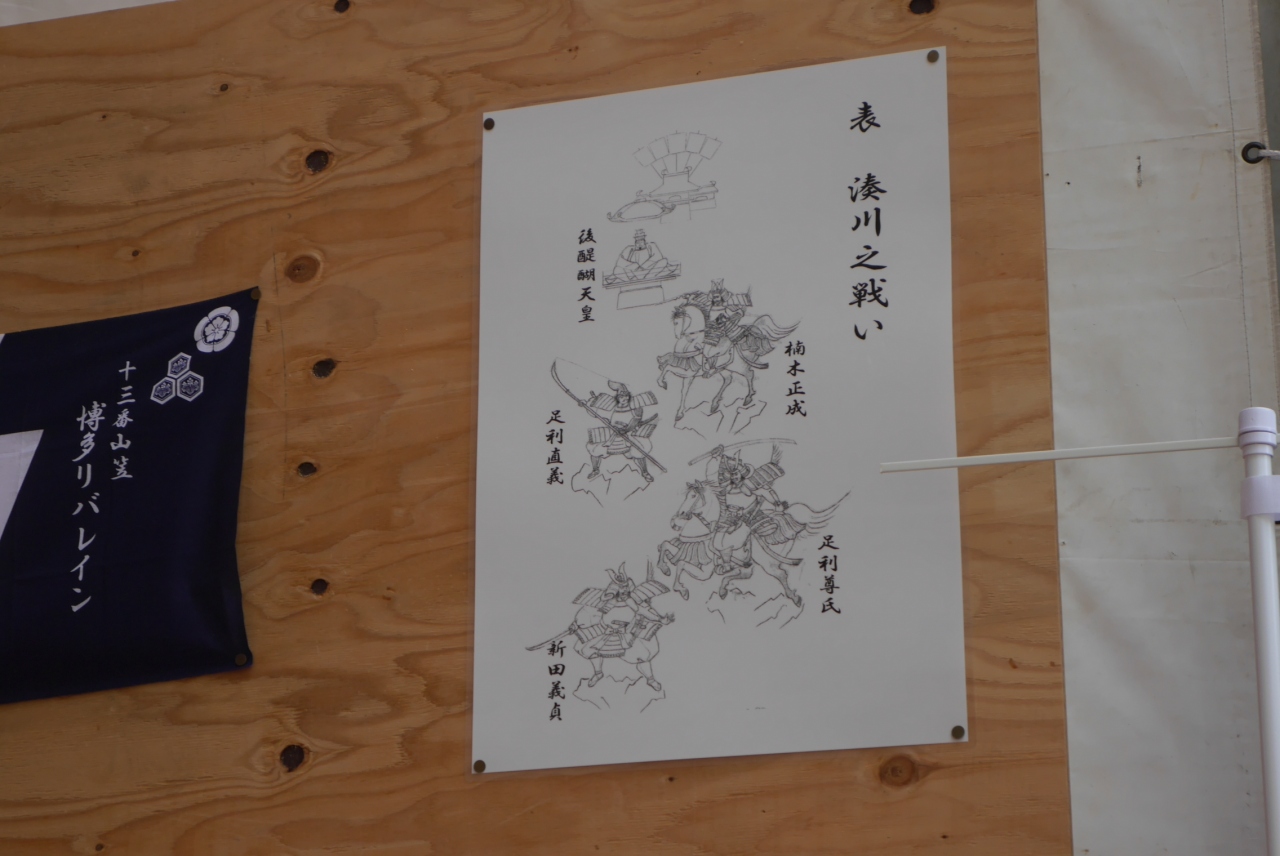 十三番山笠で表は「湊川の戦い」。ご醍醐天皇を上に置き、新田義貞、足利尊氏、足利直義と楠木正成が描かれています。見送りは「祝博多の花咲爺」でした。