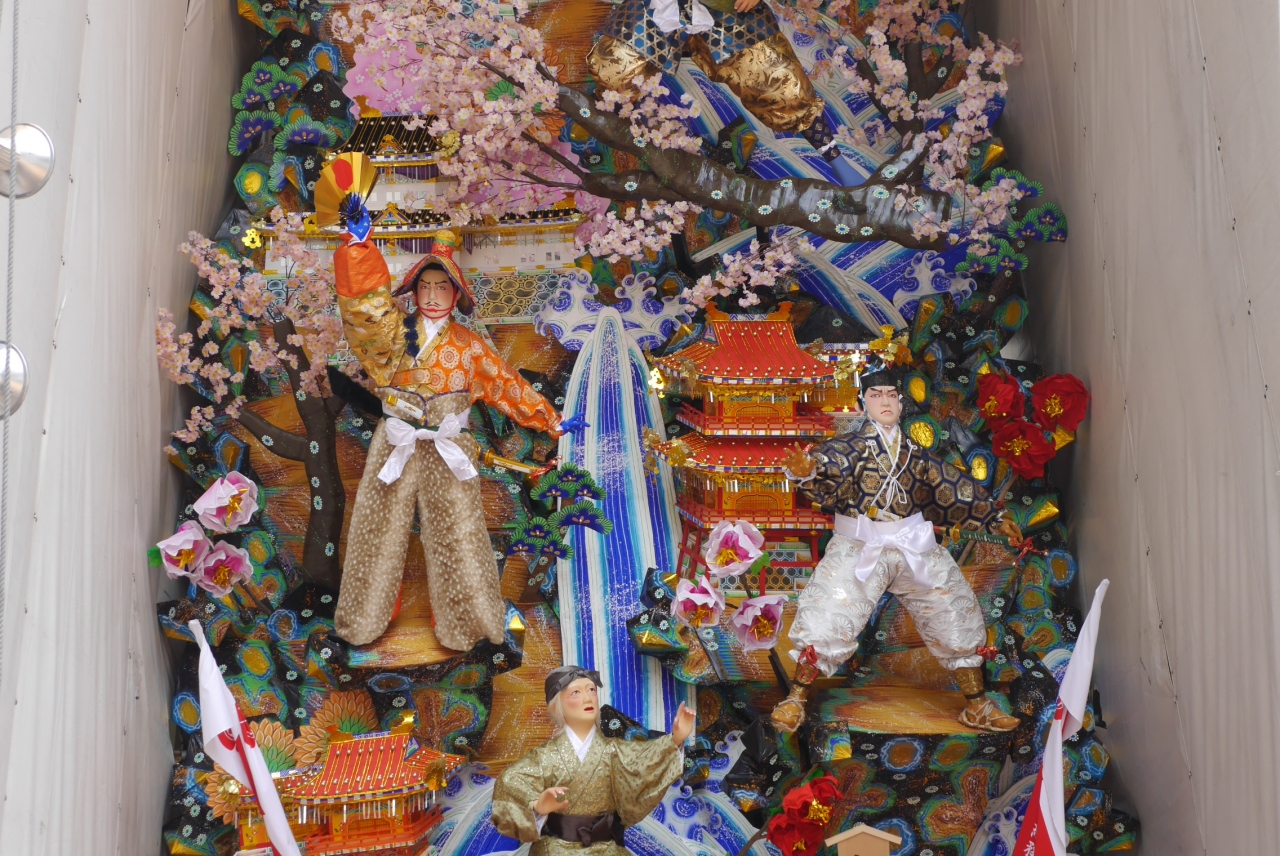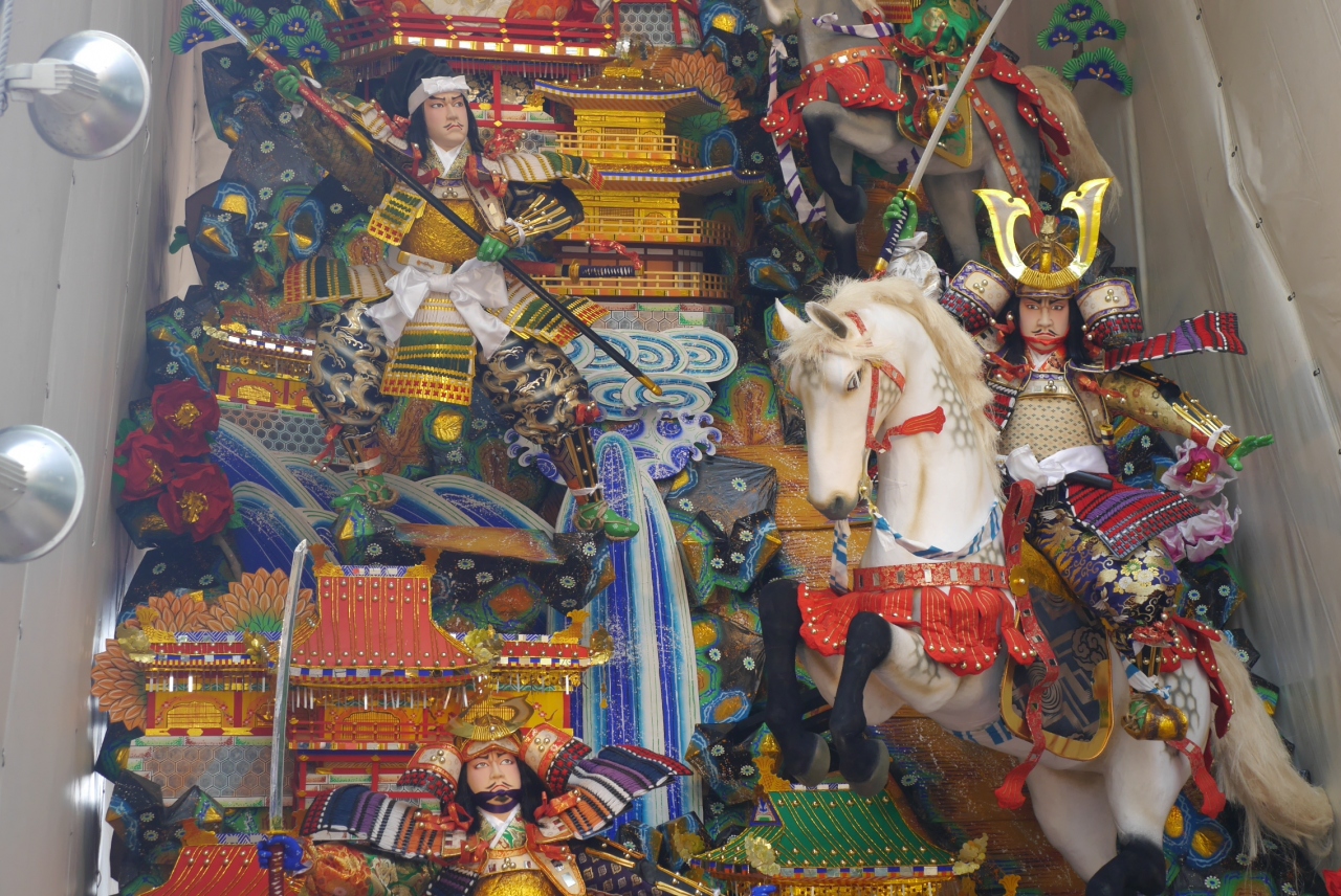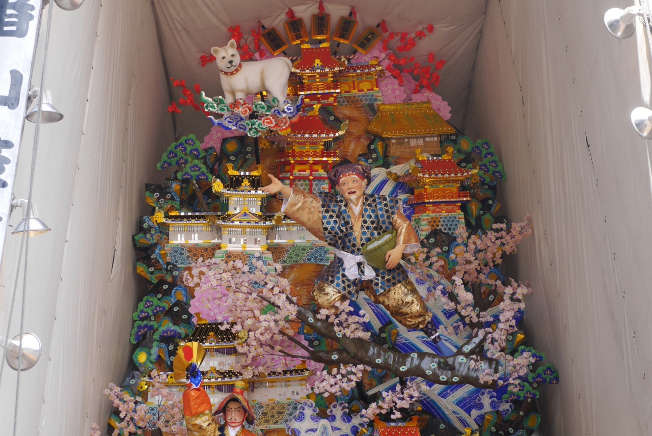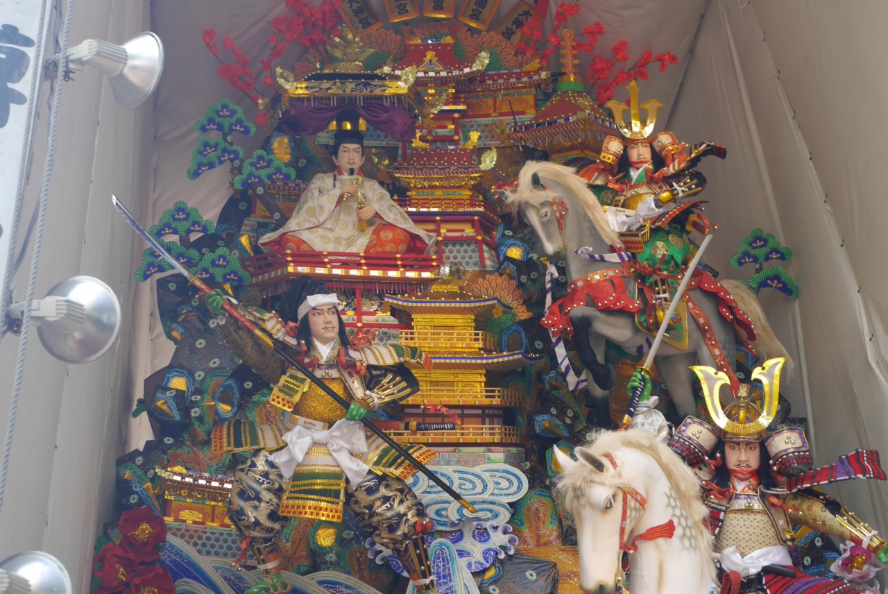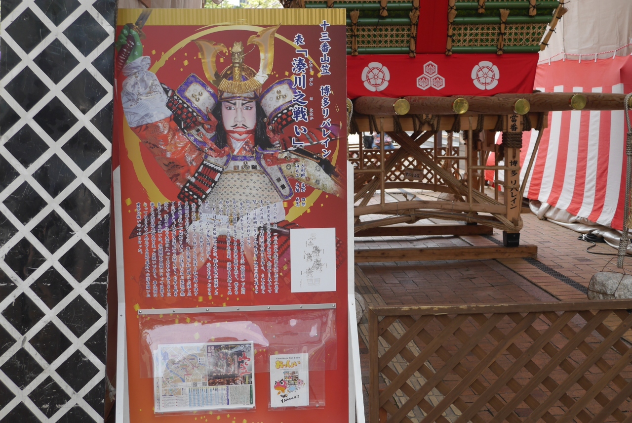十三番山笠で表は「湊川の戦い」。ご醍醐天皇を上に置き、新田義貞、足利尊氏、足利直義と楠木正成が描かれています。見送りは「祝博多の花咲爺」でした。