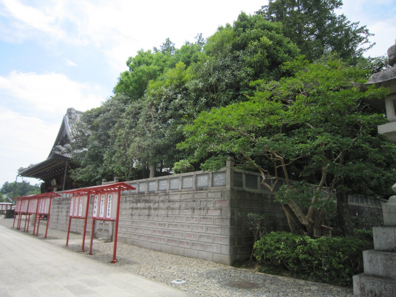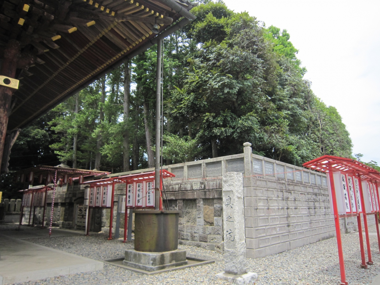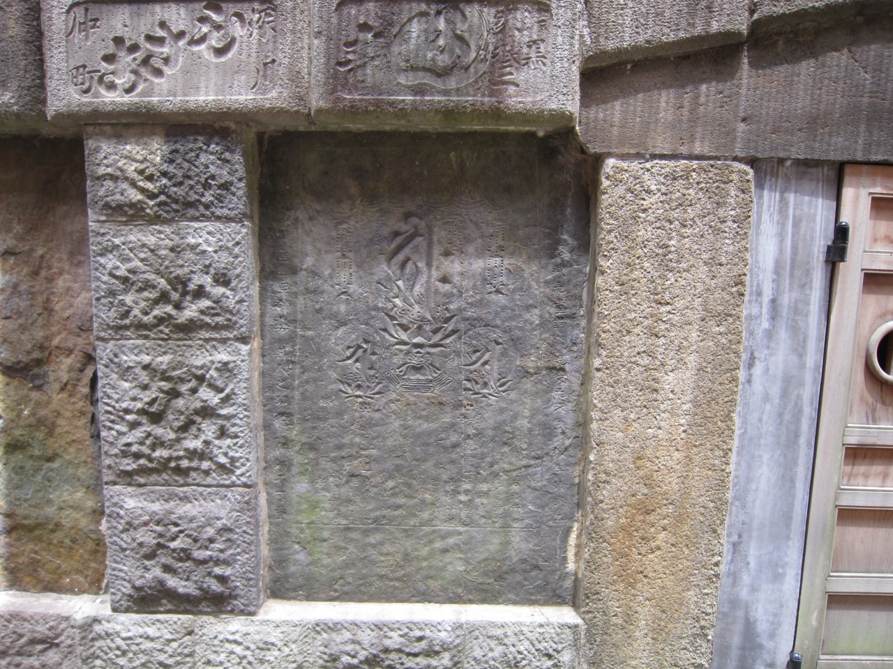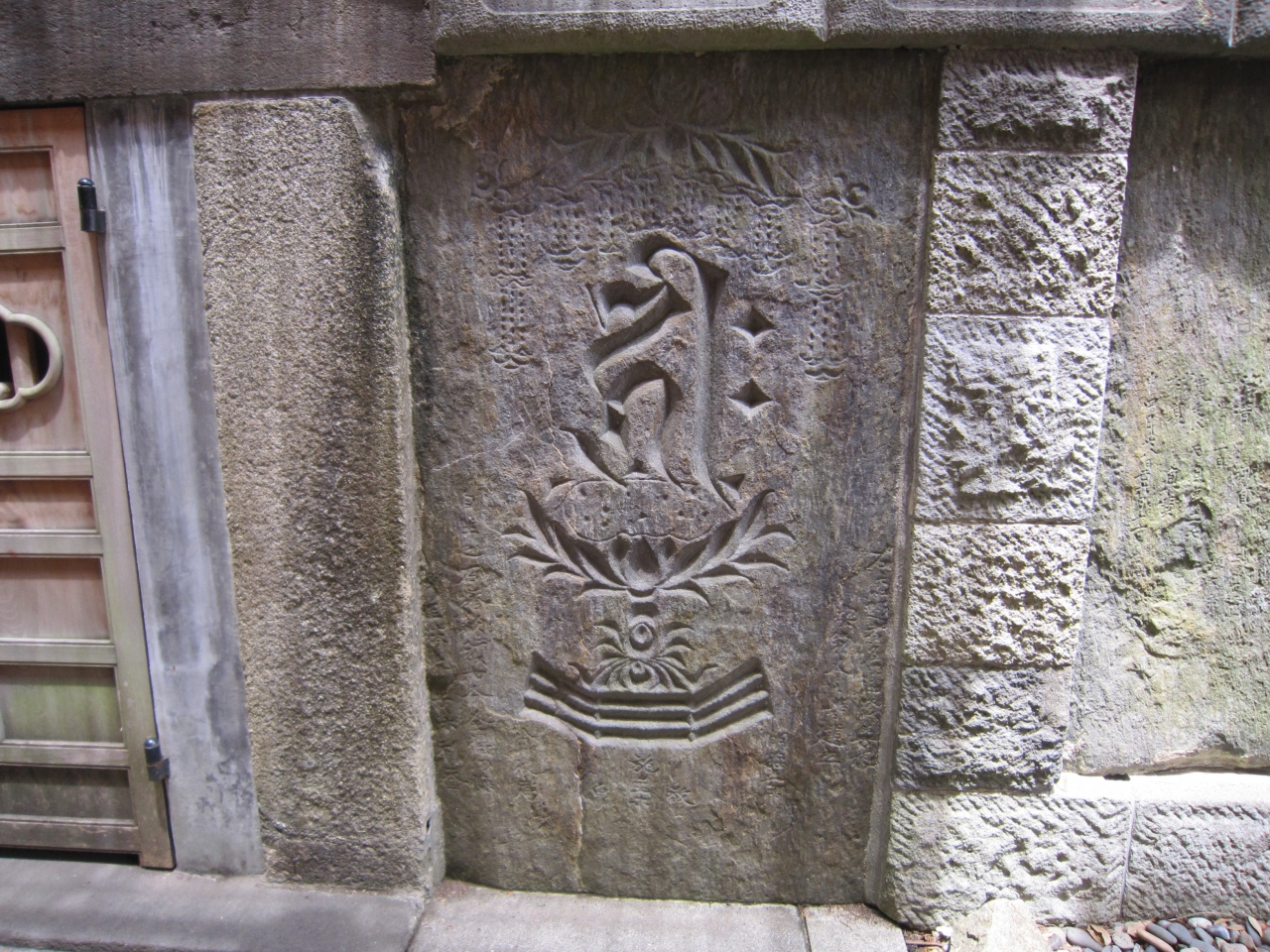 光明堂の後ろです。石垣に囲まれて洞窟となっているそうで、正面に大日如来が安置しているとのことです。7月上旬祇園会の日に開扉するそうです。行事の前に行ったので中は見られず真っ暗闇です。周りにたくさんの燈籠が立てられおり、またお寺の入口には祇園会の表示板が掲げられていました。行事が近かったのです。石垣には板石塔婆が埋め込まれ、その内、入口左右の石碑は県有形文化財に指定され考古学上貴重だそうです。