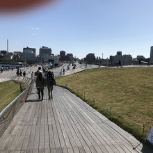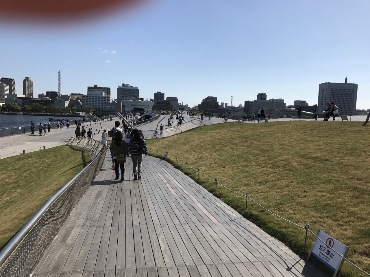 二度目の横浜港大桟橋見学。旅客ターミナルの屋根の上を散策できるのが面白いです。しかも足元は木製デッキ、風は心地よいし、主だった横浜の観光スポットはここから見渡すことができるくらい景色も最高です。芝生の上が立ち入り禁止なのが残念でした。