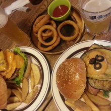 平日の18時頃家族で行きました。子どもができる前は時々行っていたお店でしたが、この日久しぶりに、初めて子ども連れで行きました。ボリュームたっぷりの豪華ハンバーガーが美味しいお店です。「米ナスバーガー」¥1380と生ビール(ヒューガルデン)¥690、オニオンリング¥380をいただきました。今まではいつも「1/2アボカドバーガー」にしていましたが、今回初めて「米ナスバーガー」にしてみました。立派な米ナスが2枚入って、食べにくくはあったけれど、ハンバーグとよく焼いた米ナス、ベーコンのコンビネーションは美味しかったです。ハーブがよく効いた付け合わせのフライドポテトは家族に不評でした。お気に入りのオニオンポテトは、変わらず絶品。ここに来たら食べてほしい逸品です。美味しいハンバーガーとビールが食べたくなったら、オススメのお店です。子連れでも大丈夫でした。他にもお母さんと子どもがお食事していました。