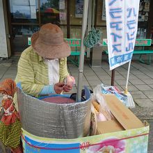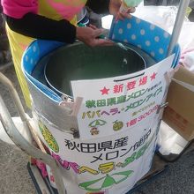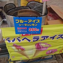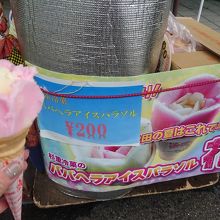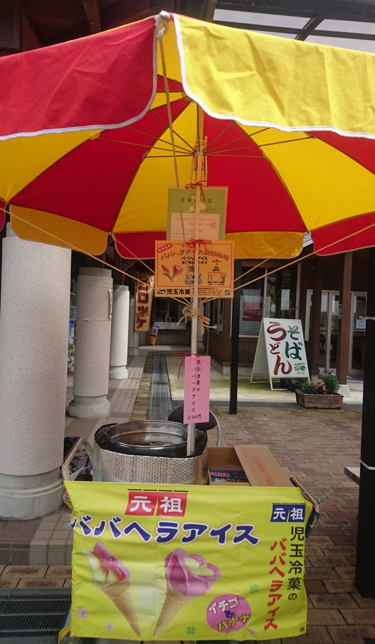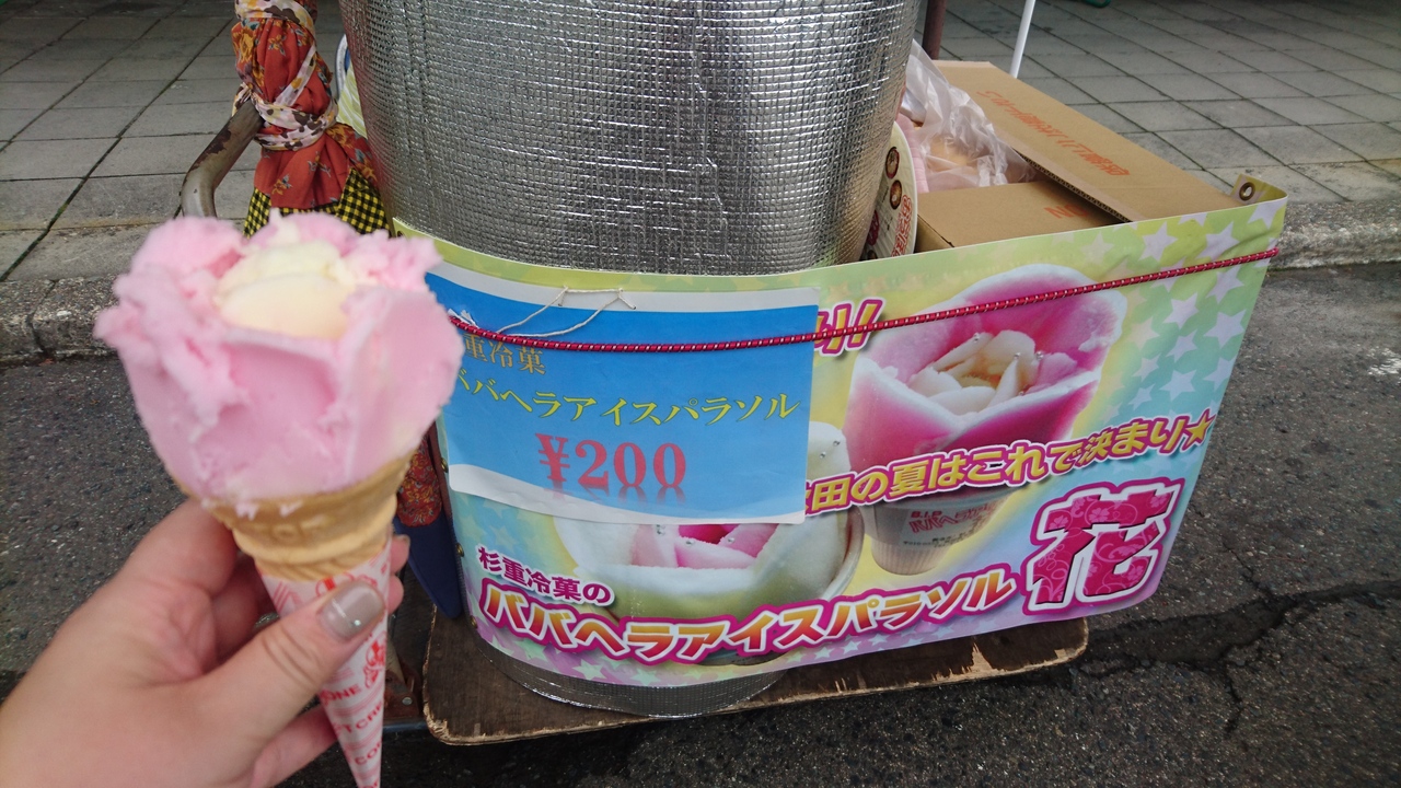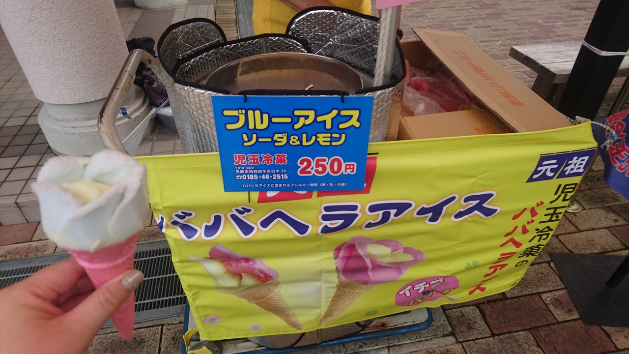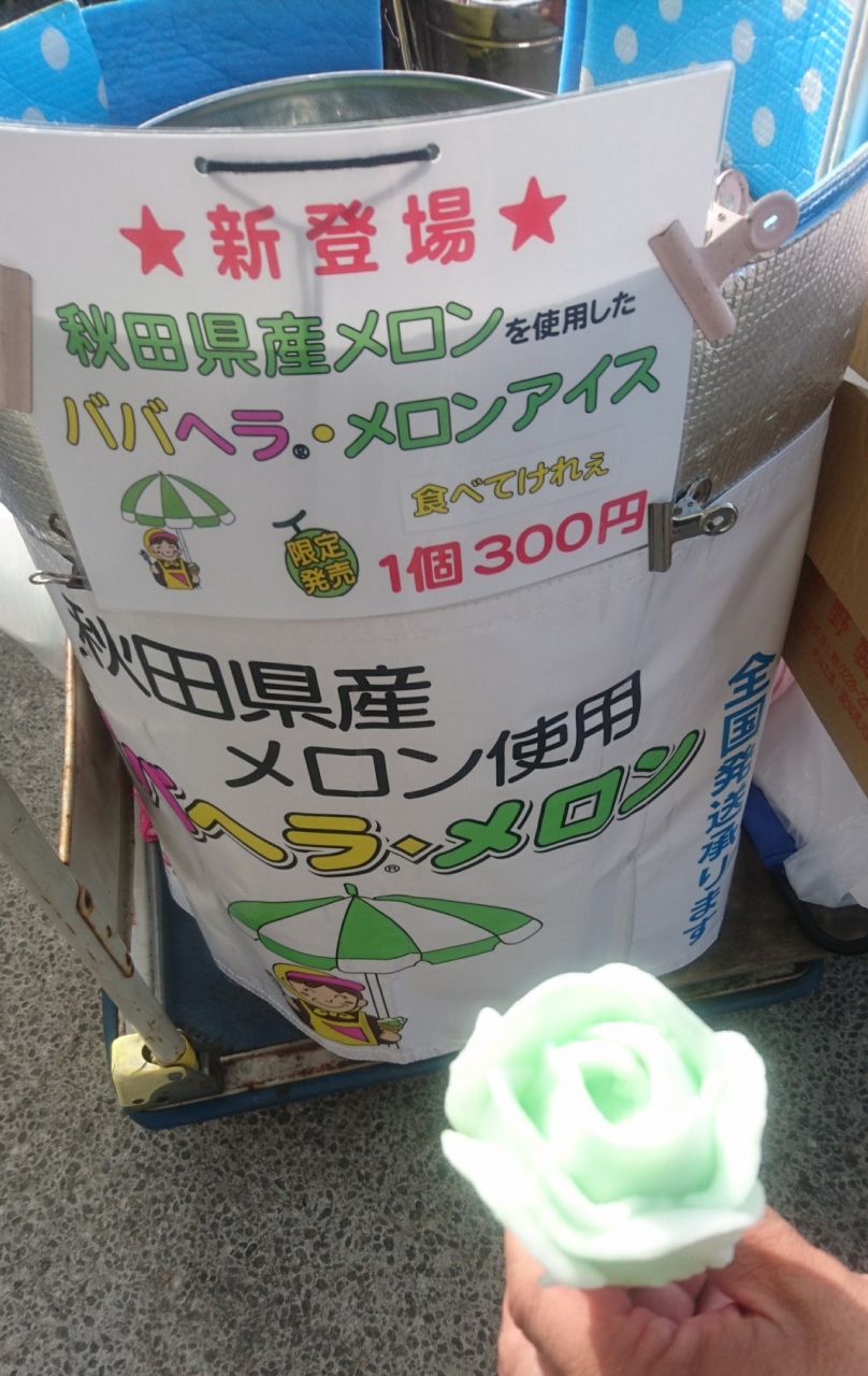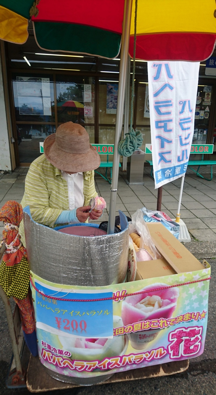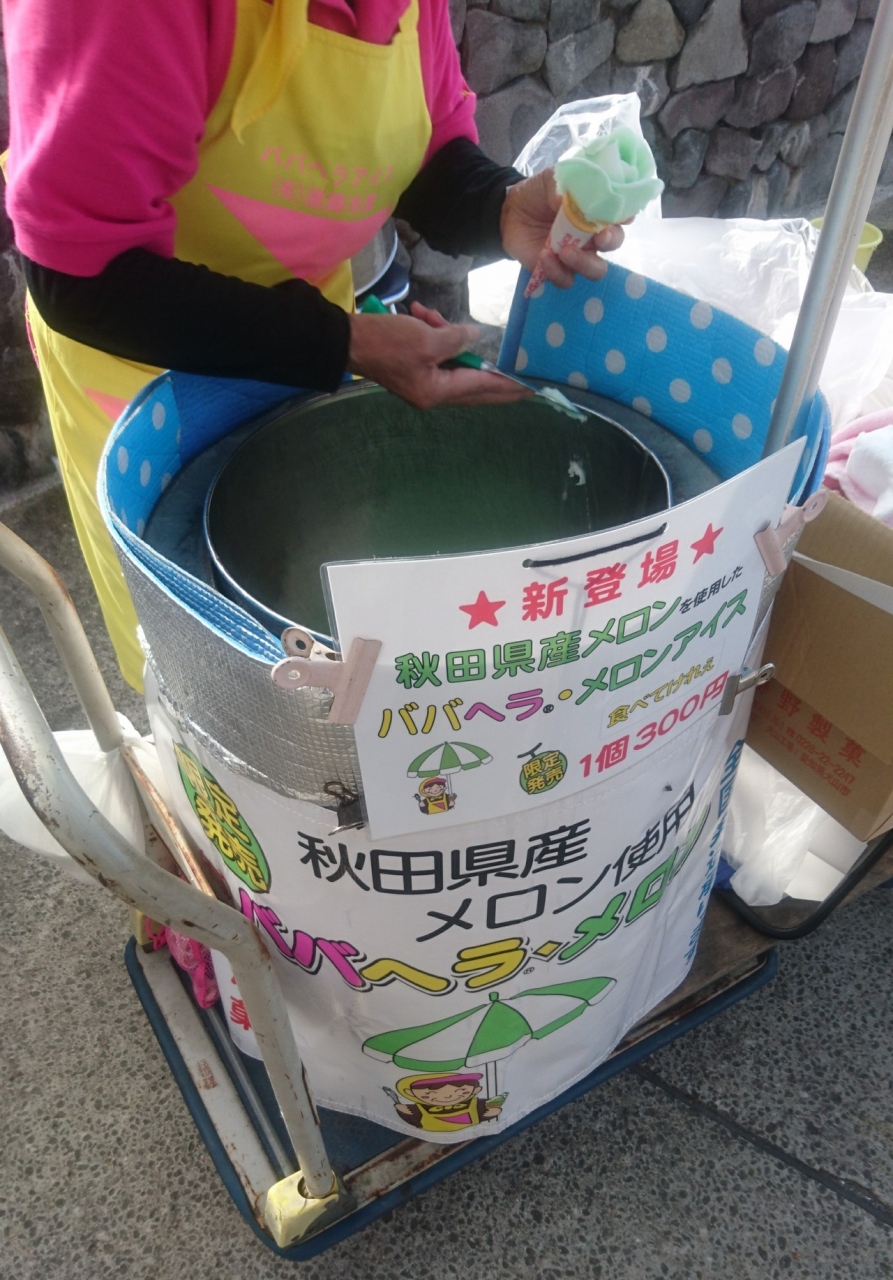秋田に行ったら食べてみたかったババヘラアイス。年配の女性の方がパラソルの下でお一人で販売されている。県内ドライブ中に6箇所遭遇し、内3箇所で購入。