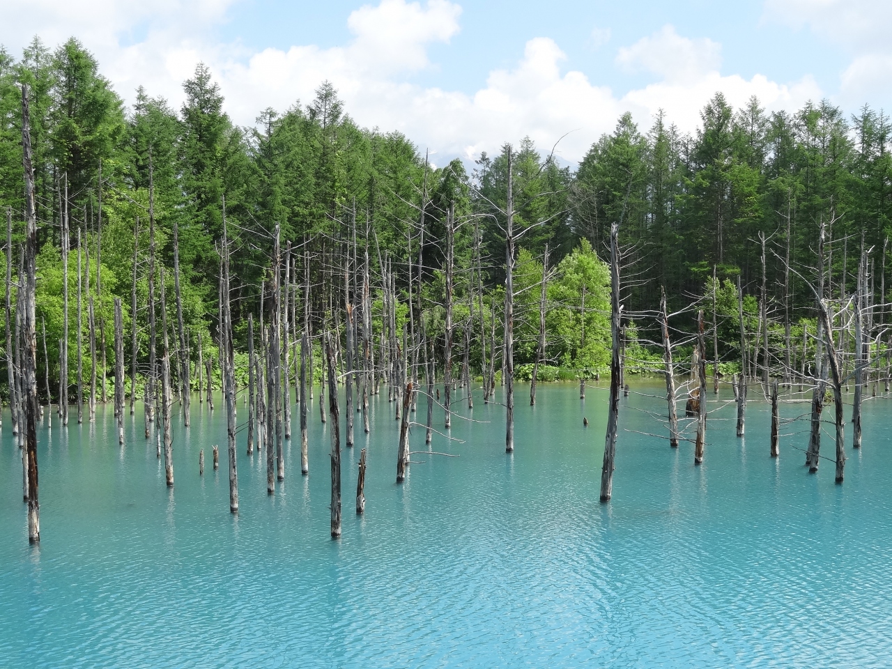 バス専用の駐車場から青い池まで5分くらい未舗装の車道の脇を歩きます。くるまの往来には気を付けなければならないです。散策路に入ると右手に池のようなものが木立の間から見え隠れします。さらに進むと、本当に青い池が出現!立ち枯れした木々がいっぱい青い水面からすっくと立っていて、そのさまは上高地の大正池をおもわせるようです。あるいは裏磐梯の五色沼のような神秘的な青さを彷彿とさせているかのよう。しばらく見とれてしまいます。なぜ、何の飾りもない名前になってしまったんだろう、と不思議でなりません。