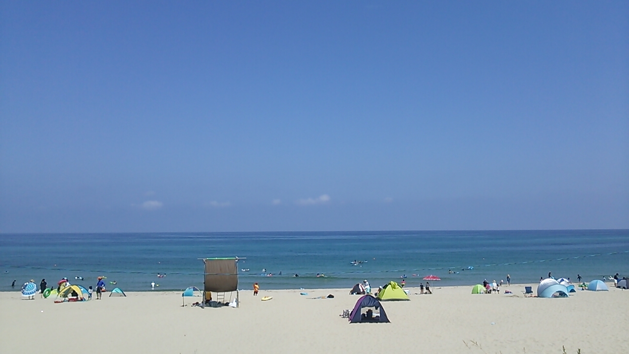 砂浜自体は左右に広がっていますが、中心部に位置する駐車場付近には多くの海水浴客が訪れていましたが、左右に外れると人の姿は少なく静かでした。また当日は天気がよく、景観は綺麗でした。