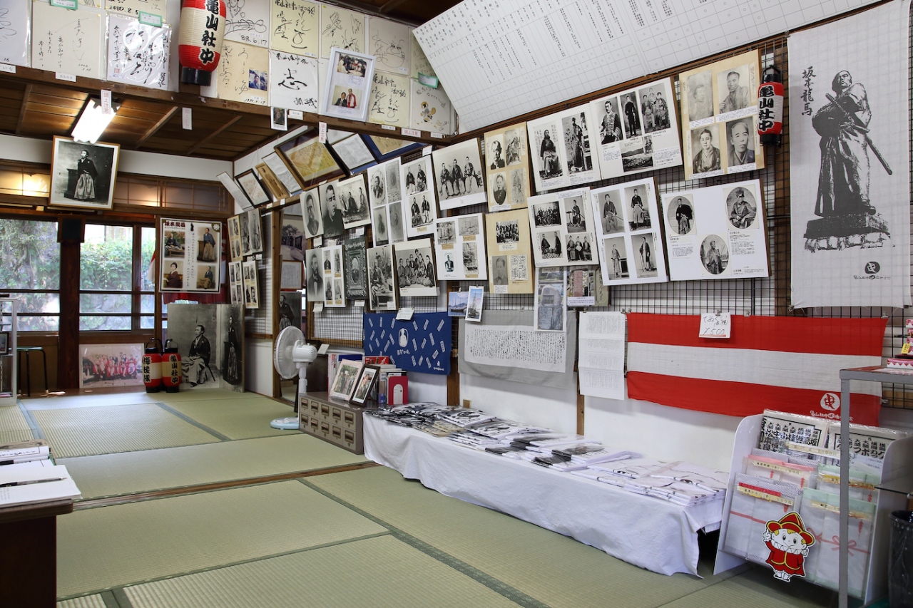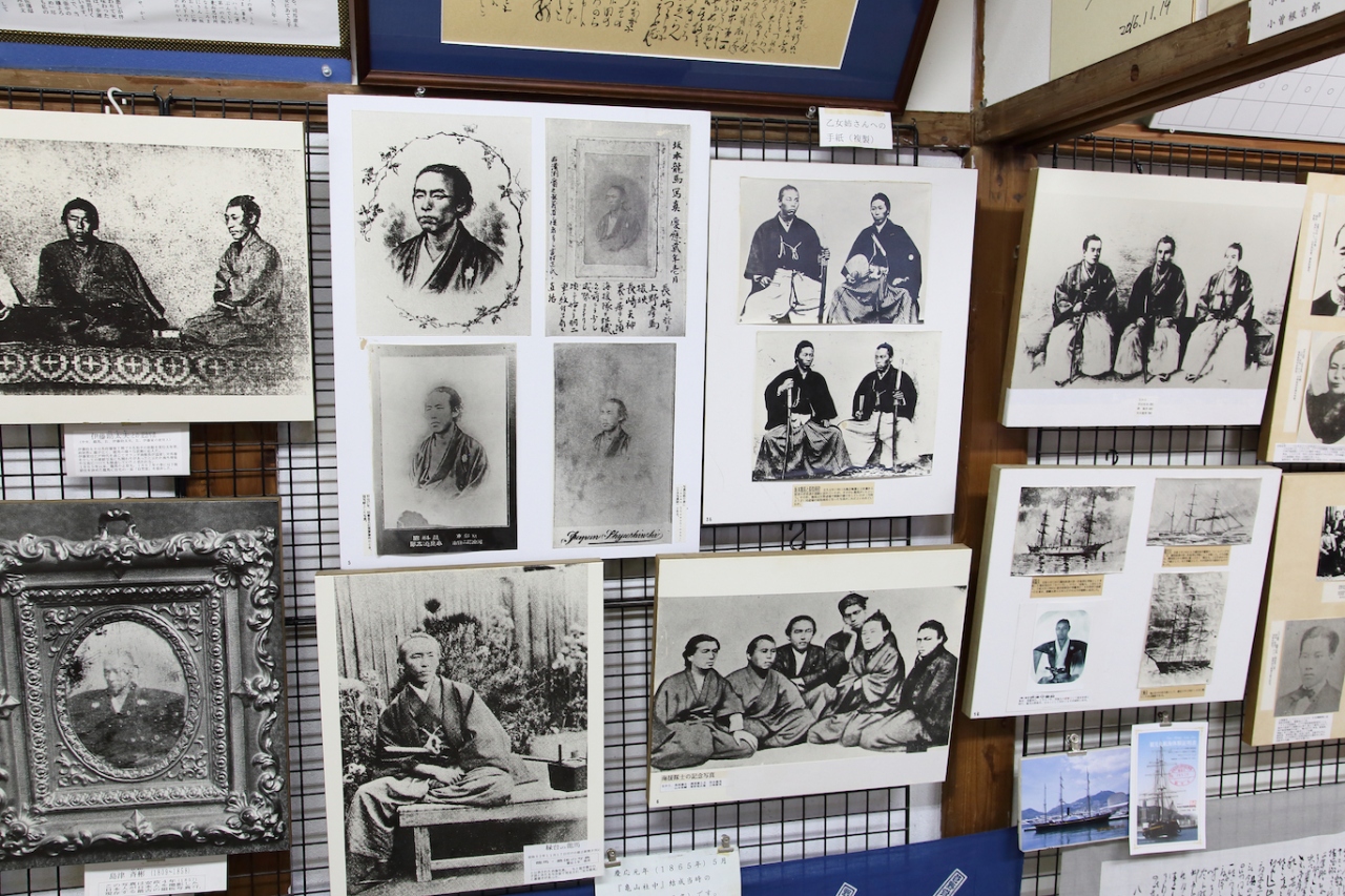 展示場の名前の通り、幕末の有名人の写真が所狭しと飾られています。写真だけでなく、その人の事跡も説明されているので、見所は多いです。亀山社中の隊員のみならず、維新の志士や幕府方の人間など多岐に渡って展示されていますから、歴史ファン、幕末ファンにはお勧めの場所です。また、龍馬グッズも多く扱っているので、こちらで土産物を探しても良いかも知れませんね。近くに自動販売機も設置されていますし、龍馬通りの散策の途中に立ち寄るには良い場所と思います。