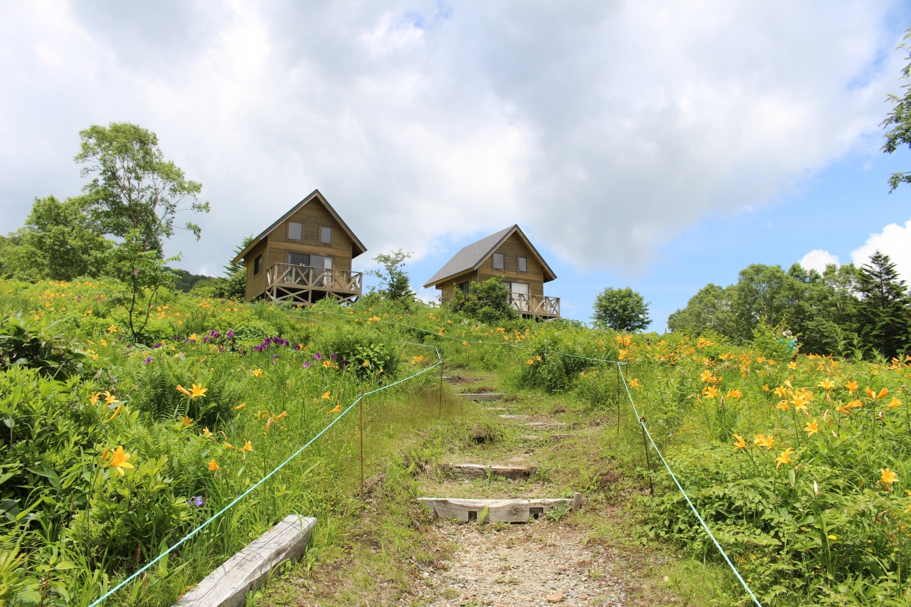 バンガローは、10棟以上あるようだが、うち2つのロケーションは高台の展望のよい所にあり、野反湖が望め、泊まりたい気にさせられる。