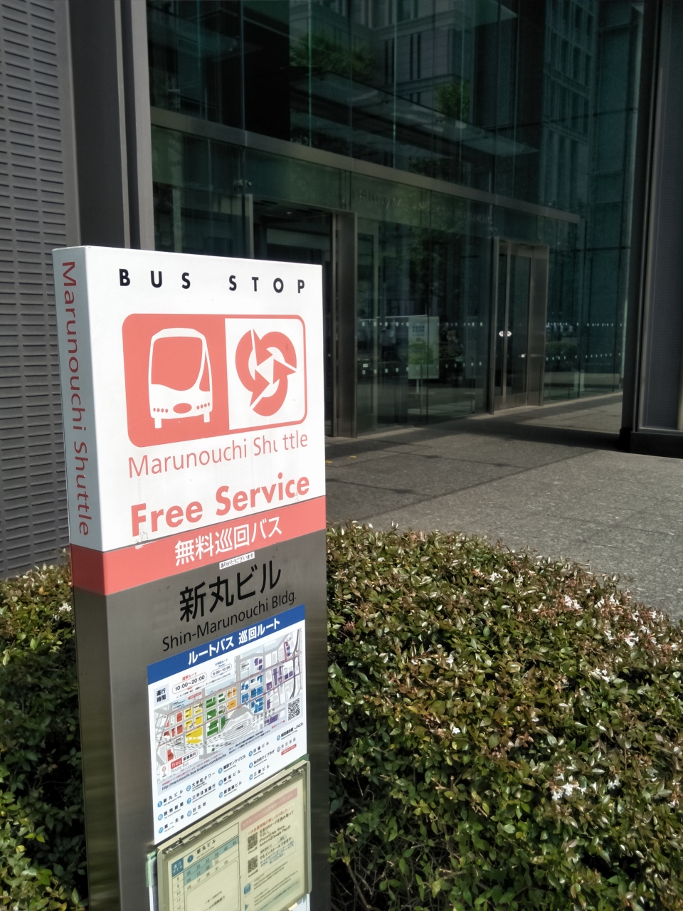 東京駅の向かい側、新丸ビル前から出発する無料巡回バス「丸の内シャトル」。朝の時間帯は大手町方向をコンパクトに周ります。